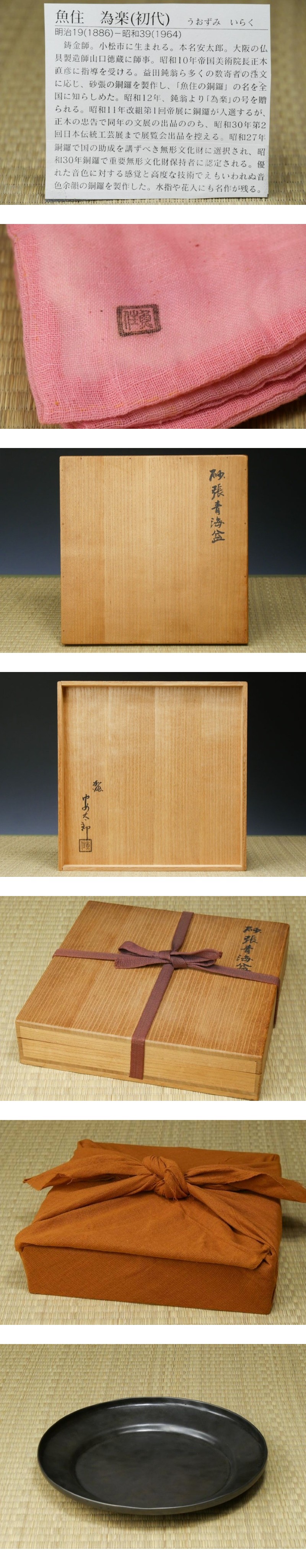 明治19年生れで砂張の銅鑼の名工として益田鈍翁をはじめ多くの数寄物の注文に応じた初代魚住為楽の作品です。本名を安太郎と言い、昭和30年人間国宝となりました。この銅鑼形の青海盆は銅と錫と砂を交ぜて作られた砂張で出来ていて、裏を返してかるく指で小突けば見事な音が鳴ると言われています。