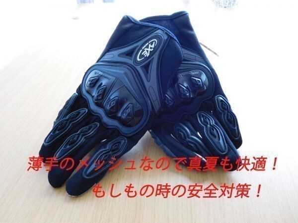 | 暑い季節にとても使いやすいメッシュ生地の薄手のグローブになります。 メッシュ生地なので風通しも良く夏でも快適に走れます。 夏用ですが転倒した時のけが予防にナックルプロテクターもついております。 もちろんバイク以外でもお使いいただけます ロードバイク、サバゲー、アウトドアなど活躍する場面は様々です。 夏場の汗がベタベタでグローブが脱ぎにくくなった場合でもグローブがつけたま人差し指でタッチパネルに触れます ガソリンスタンドのタッチパネル、スマホでのナビなどツーリングの際にとても便利です。 現在ご覧になっていただいている商品の別の色などもございます 色 赤/青/黒 サイズ M/L/XL 上記の種類を出品しておりますので 是非ご覧ください。 ※落札される際は カラー・サイズなどお間違えの無いようお願い致します。 ※発送さしていただく商品は 現在ご覧になっているオークションの商品を発送さしていただきます。 他のカラー・サイズに関しましては出品リストから探していただければございますのでそちらからお求めください。 | ||||||