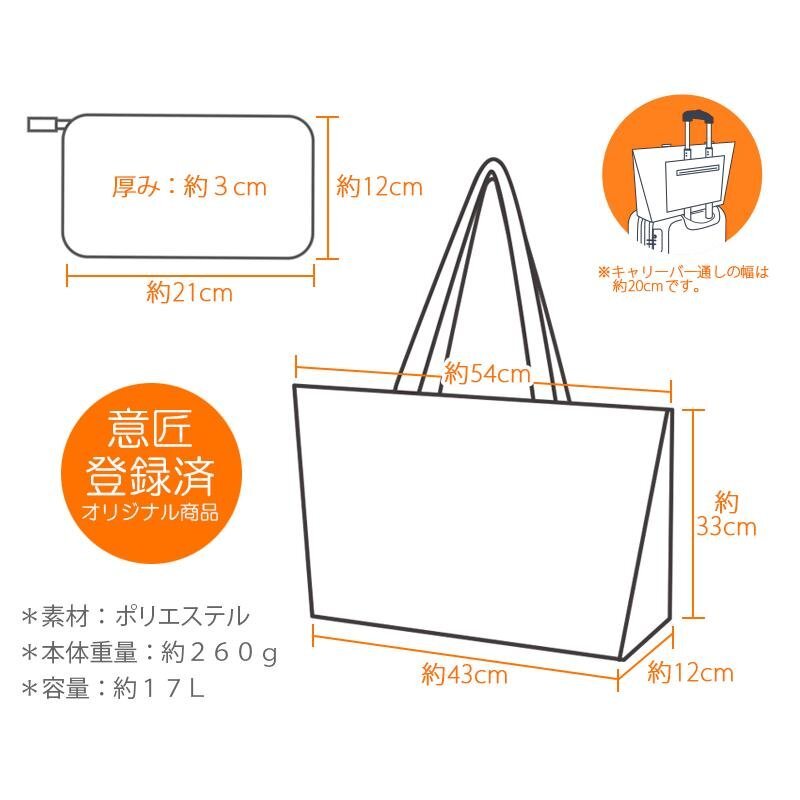 スーツケースに載せてもズレ落ちない『キャリーオン機能付』なので、旅行時のお土産入れやサブバッグに便利です。