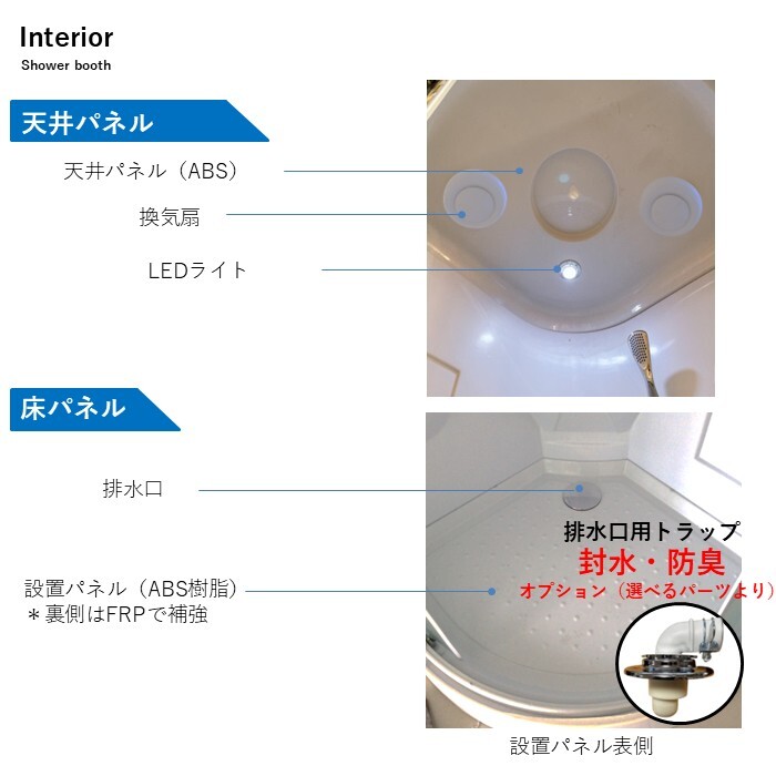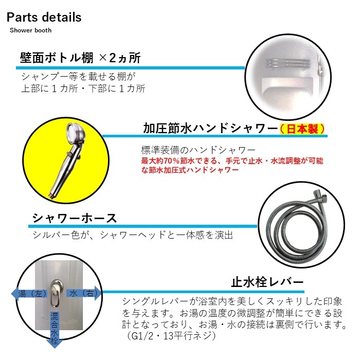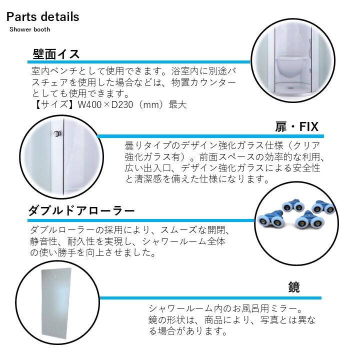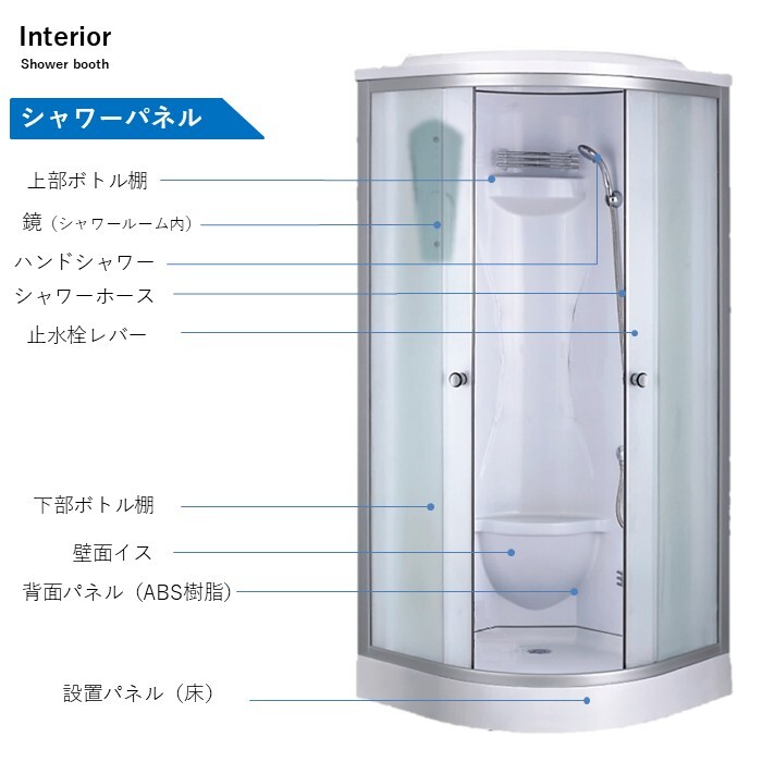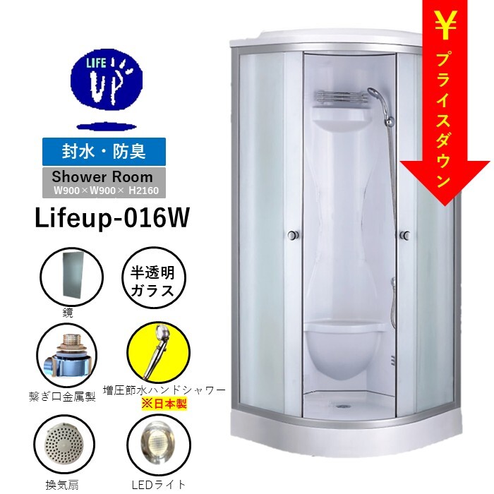 室内にゆとりがあり、椅子もついているため、ゆったりとシャワータイムを楽しむことができます。 LEDライトや換気ファンを備えたシャワーユニットがこのお値段です! 前面ガラスは半透明シルクガラス(強化ガラス)を使用、光を通しシルエットは映りますが、中の様子は見えません。 シャワールームに必要な機能を厳選したハイクオリティモデル。 商用・家庭用、どちらにも適した汎用性の高いモデルです。 本商品は組み立て式の商品です。 組立説明書がございますので、お客様ご自身で簡単に組み立てることが可能です。 組立作業は工具を使える方2名で、2時間~半日程度で設置可能です。 (コーキングの時間は含まれておりません。) シャワー等の水栓金具は背面パネルに取り付け済ですので、組立家具のようにビスで床パネルや背面パネル等を固定するだけで簡単に設置できます。その後コーキングと給排水の繋ぎ込みを行います。 この価格でシャワーの増設、リフォームが可能です!! 商品説明最後に、各注意事項をのせております。 必ず、ご購入前にご確認下さい。 【商品紹介動画】YouTubeで商品紹介動画をご覧いただけます。 ※YouTubeで同タイプの商品紹介動画をご覧いただけます。 【組立解説動画】組立方法を詳しく解説した動画もございます。ご自身で組み立てされる際も安心です。 (※lifeup-016は、lifeup-014と同じ組立方法です。) 【lifeup-010 lifeup-014】シャワーユニット組立解説動画その1:商品の開梱方法について 【lifeup-010 lifeup-014】シャワーユニット組立解説動画その2:本体の組立方法について 【lifeup-010 lifeup-014】シャワーユニット組立解説動画その3:扉・天井パネルの取り付けについて 【lifeup-010 lifeup-014】シャワーユニット組立解説動画その4:配線・防水工事について ※海外輸入品の為、サイズ、組み立てに若干誤差があり、細かなキズや汚れ等がある場合がございますのであらかじめご了承の上ご購入ください。 | ||||||||||||||||