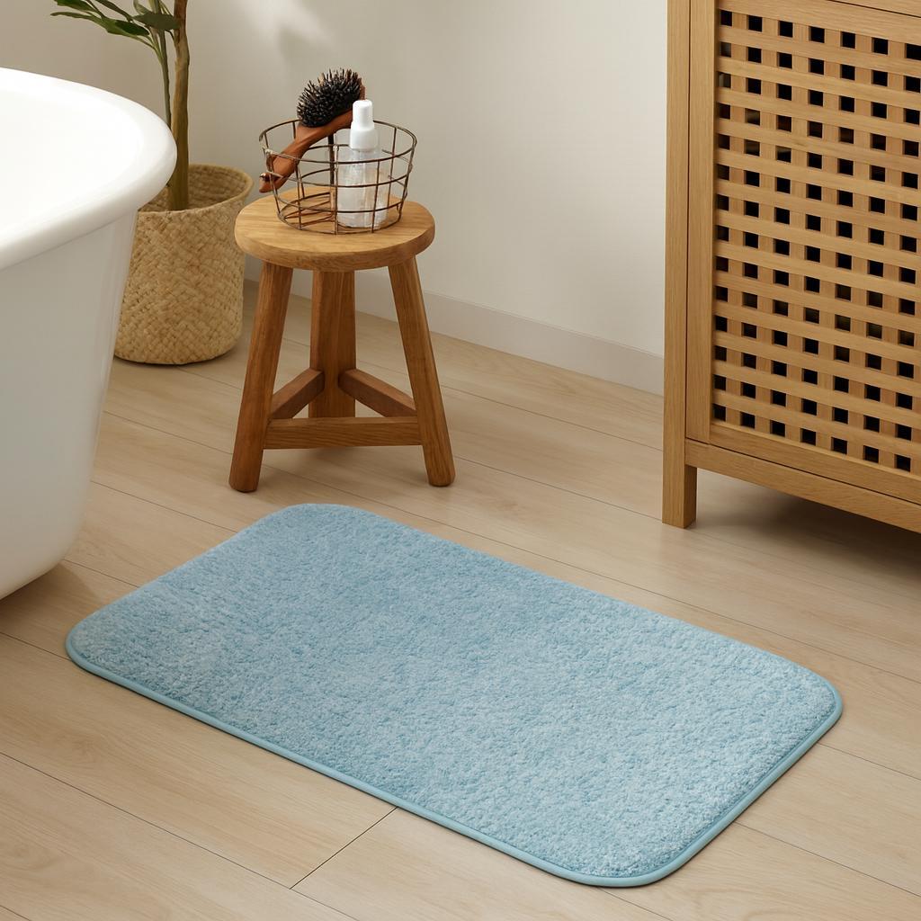 毛足が長いのにさらっと乾く! すばやく吸水、発散させる長繊維「コスモトロン(R)」を使用した吸水速乾バスマットです。