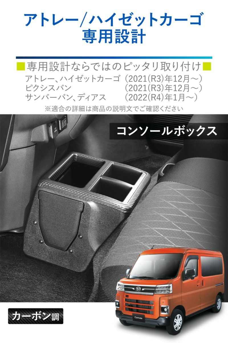 アトレー/ハイゼットカーゴ用コンソールボックス。 細缶から500ml紙パック飲料が入るドリンクホルダーが2か所 捨てやすい位置にあるゴミ箱を備えたアトレー/ハイゼットカーゴの 前席中央の足元にピッタリの多機能なコンソールボックスです。 ●質感の高いカーボン柄デザイン ●細缶から紙パックまで多様な飲料ケースに対応 ●深さの違うドリンクホルダー ●シガーソケットやUSBポートの邪魔をしないポジション ●座席に干渉しない車種専用設計 ※ドリンクホルダーにドリンクや小物が入っている場合、 座席と干渉する可能性があります。 ●ゴミ捨てがカンタンで容量もちょうどいいゴミ箱 ●ドライバー1本5分程度で組み立て完了+置くだけジャストフィット 【適合車種】2023(R5)年11月現在(以降の車両は未調査) |
