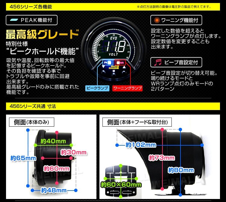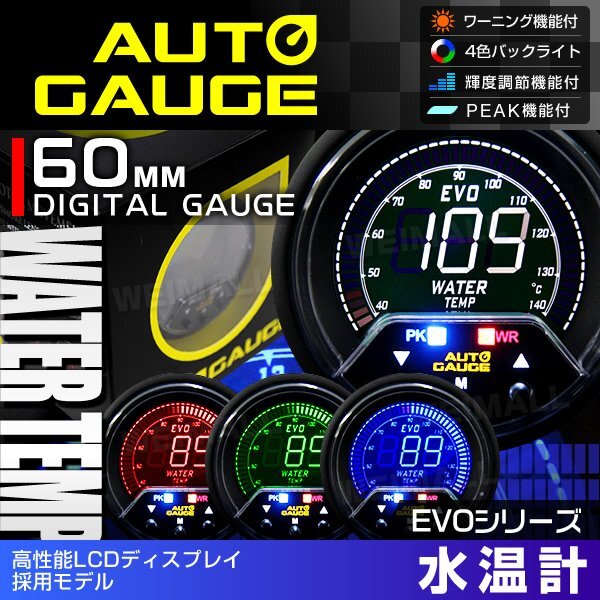 高性能LCDディスプレイ採用 オートゲージ プレミアム 456シリーズ EVO デジタルゲージ 水温計 60mm 点灯色: ホワイト / レッド / グリーン / ブルー 4色LCD ピークホールド機能付 ワーニング機能付 輝度調節機能付(6段階) バックライトカラー切替機能付 |