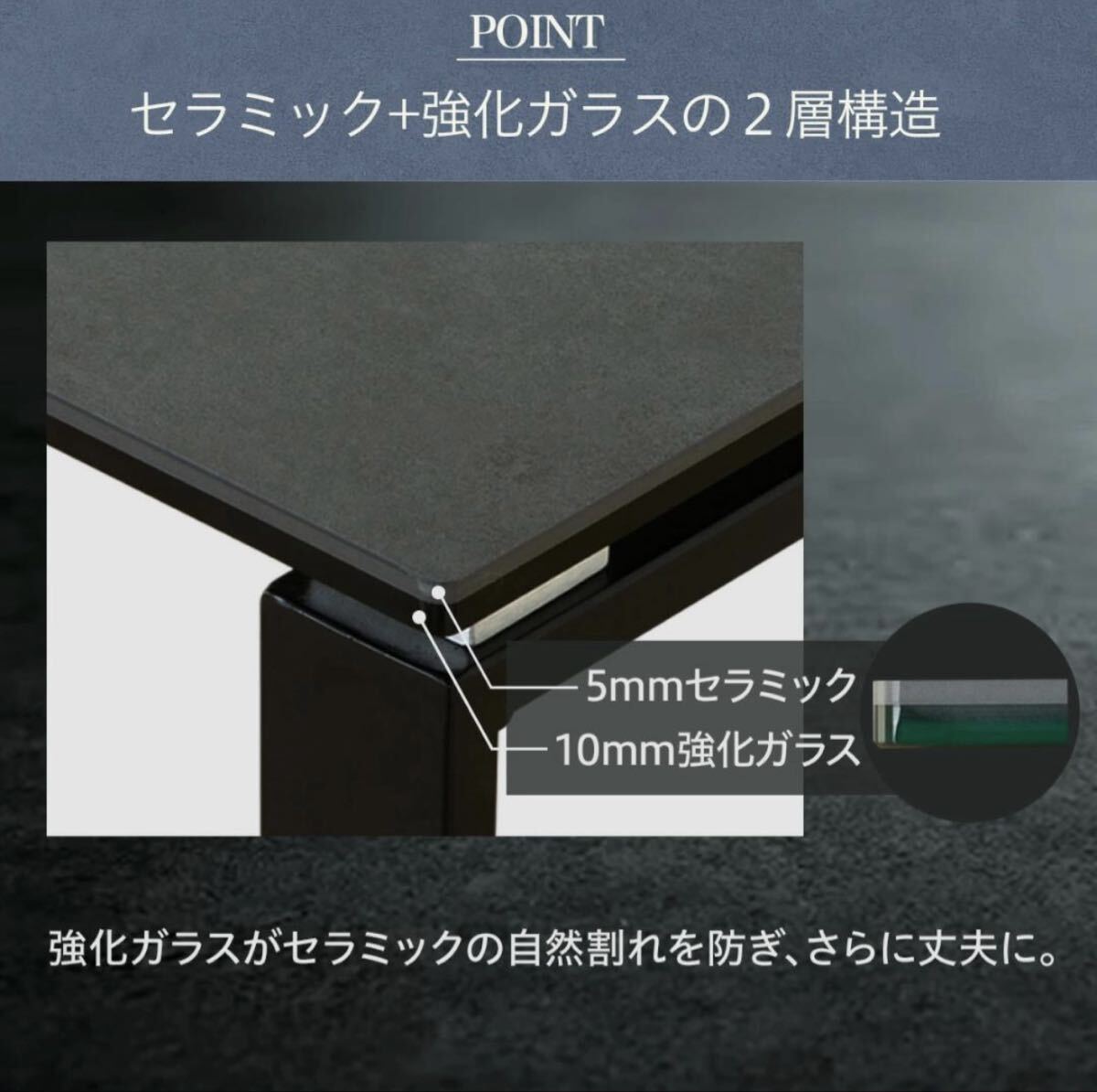 - 構造: 2層構造 (5mmセラミック + 10mm強化ガラス)