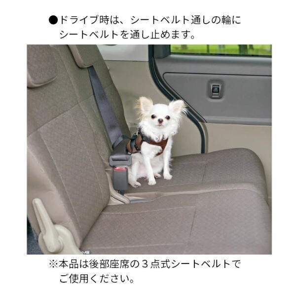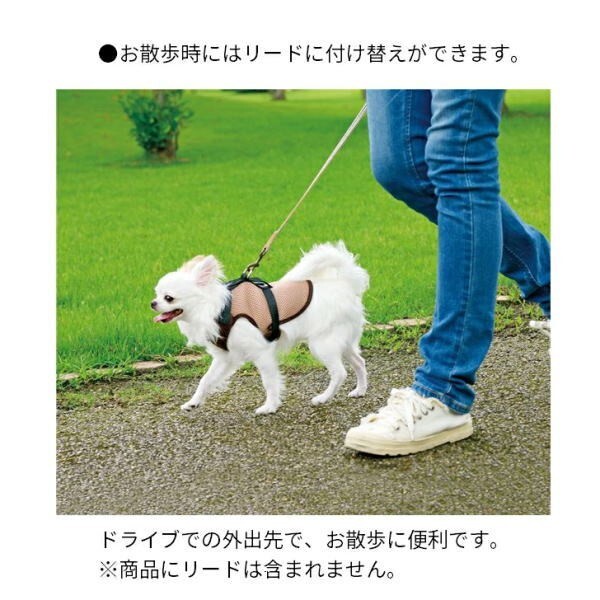 ペットと一緒に快適ドライブ ♪ ●シートベルトに固定して運転席や車外への急な飛び出しを防ぎます。 ●犬に負担がかかりにくいベストタイプです。 ●お散歩時にはリードに付け替えが可能。 【対象】:超小型犬用 体重目安/4kg以下 【材質】:メッシュ:ポリエステル、バイアステープ:綿、ベルト:ナイロン、ナスカン:亜鉛合金、Dカン:スチール 【適用サイズ】:首回り:17〜25(cm)、胴回り:26.5〜40(cm)、着 丈:21(cm) |