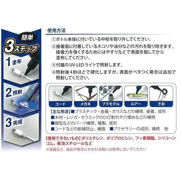| ※食器など、食品や衛生にかかわる物には使用しないでください。 ※ポリエチレン、ポリプロピレン、フッ素樹脂、シリコーンゴム、発泡スチロールなどには使用できません。 ※紫外線の当たらない部分は硬化しません。 ※UVライトは絶対に直視しないでください。 ※UVライトに使用する乾電池は別売です。別途ご用意ください。 ・掲載画像はイメージであり、実際の製品とは多少異なる場合があります。 ・パッケージや個装形態は入荷時期によって変更となる場合があります。 ・製品の仕様は品質の向上・改善のため、予告なく変更となる場合があります。 |