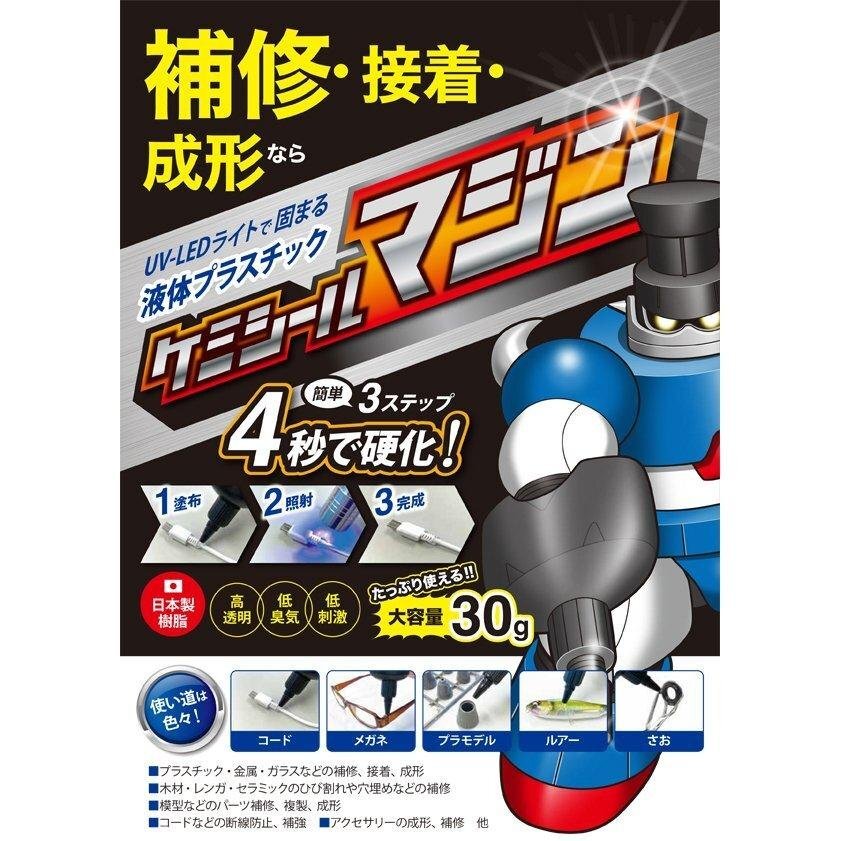 | 付属のUV-LEDを照射して固まる! 液体プラスチック「ケミシールマジン」! かんたん3ステップで約4秒で硬化! 1→塗布、2→照射、3→完成! 使い道はいろいろ! ■ プラスチック・金属・ガラスなどの補修、接着、成形 ■ 木材・レンガ・セラミックのひび割れや穴埋めなどの補修 ■ プラモデルや模型、フィギュアなどのパーツ補修、複製、成形 ■ コード・ケーブルなどの断線防止、補強、修理 ■ アクセサリーの成形、補修 など 日本製樹脂を採用。 高透明・低臭気・低刺激で使いやすい。 たっぷり使える、大容量30g! 硬化に必要なUVライトが付属! 乾電池をご用意いただけば、すぐに使用できます♪ |