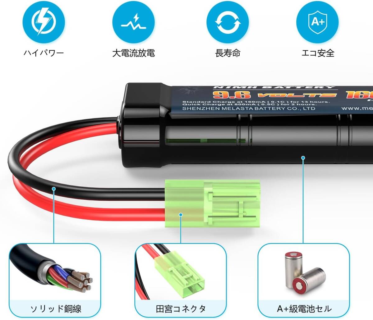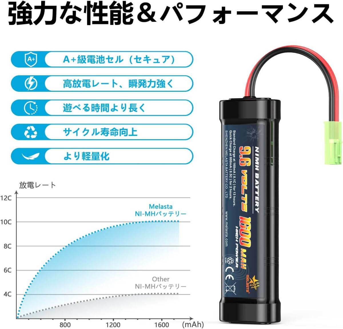 ブランドMelasta 電池セルの構成ニッケル水素 商品の推奨用途エアソフトガン 電圧9.6 ボルト 再利用可能性充電式 この商品について 【ミニSバッテリー仕様】電池素材:Ni-MHニッケル水素 電圧:9.6V 容量:1600mAh 放電率:10C ワイヤーゲージ:16AWGシリコーン プラグ:ミニSコネクター サイズ(mm):119×36×19 重さ:184グラム 【適用】 東京マルイ 次世代電動ガン エアガン ミニS 互換バッテリー及びその他のモデルガンシリーズにも対応可能。ご注意:バッテリーが装置に適合しているかどうかを確認するには、ご注文の前にあなたのモデルガンの電池容器のサイズをご確認ください 【瞬発力に優れる】ボルト数が高いと連射速度が速くなりますので、弊社の9.6Vガンバッテリーが連射速度を上げる一番手っ取り早く、電動ガンの性能を最大限に引き出す。温度変化による出力の差も少なく、安定した発射が可能になります。容量アップでより長時間楽しめます。※実際の使用時間は電動ガンの型番により異なることがあります。 【安全でエコ】Melasta 9.6V電動ガン用ニッケル水素バッテリーはISO9001認定工場に高品質の2/3A電池セル、難燃性のあるPVC素材で作られ。電池には過電流保護、過放電防止、および過充電防止機能を備えており、CE、RoHS、MSDS、UN38.3認証を獲得済ます。 【メーカー保証】お買い上げ後12ヶ月のメーカー保証をお約束します。ご使用中に電池に関するご質問がある場合は、お気軽に当社にご連絡ください、24時間内に対応させていただきます。(アフターサービス:amazon.jp@melasta.com) |