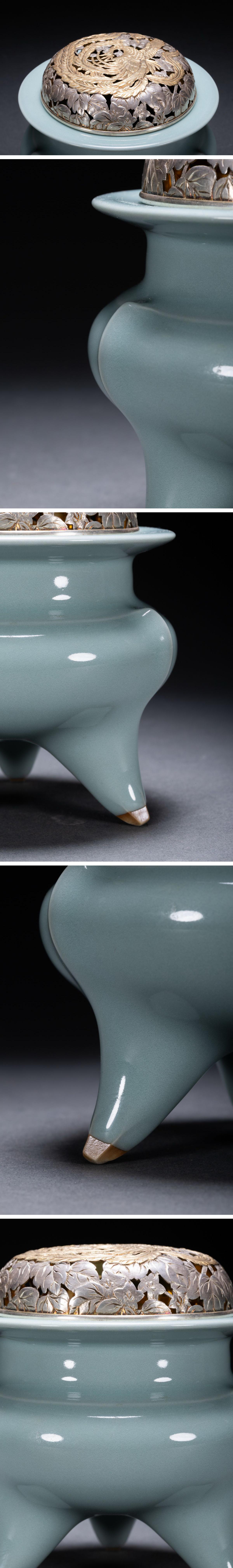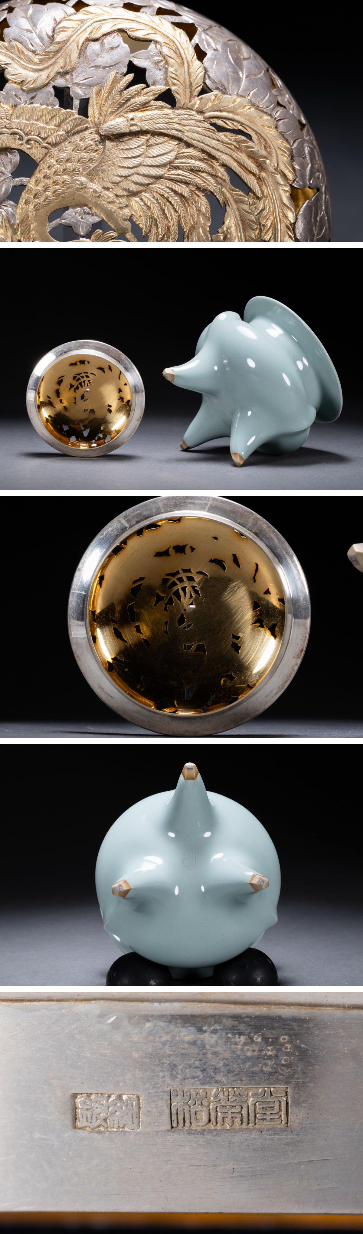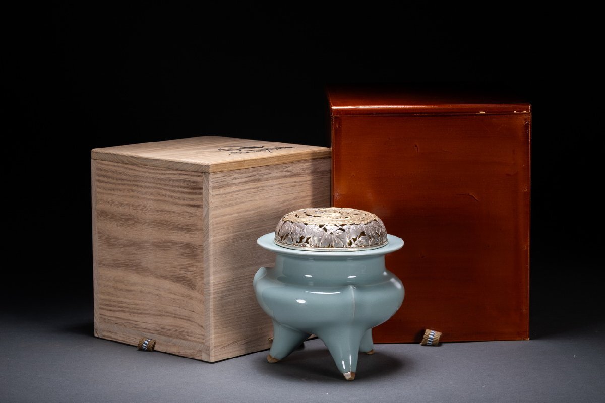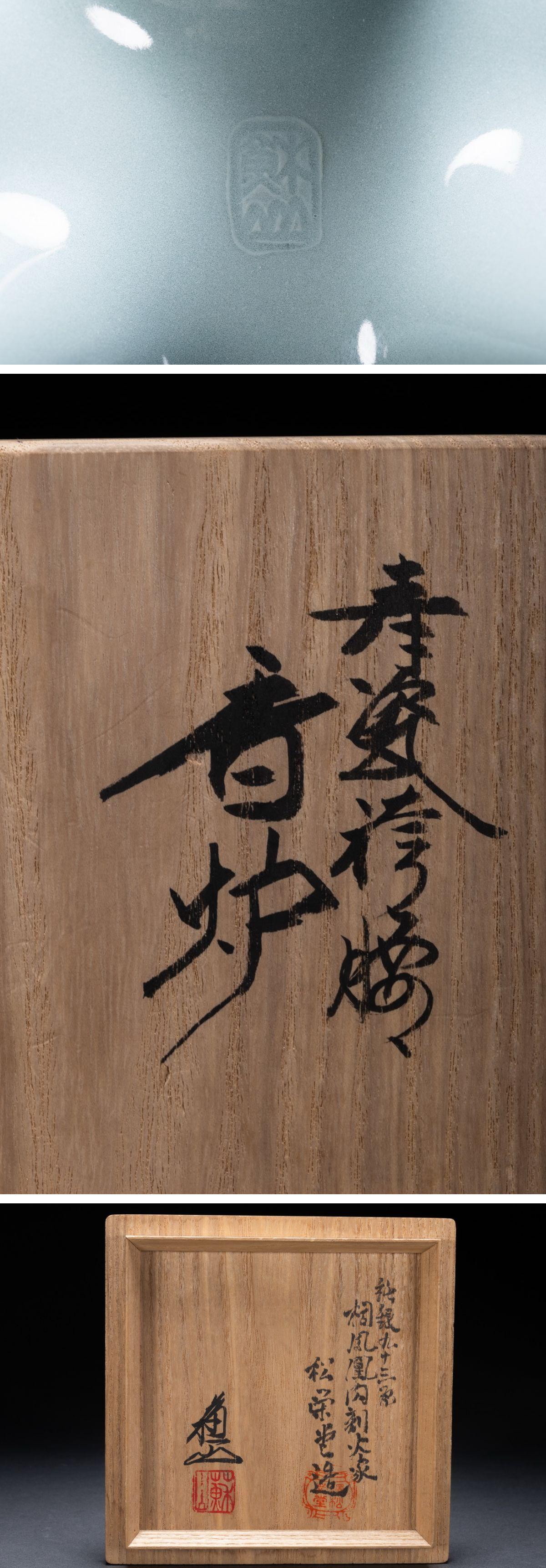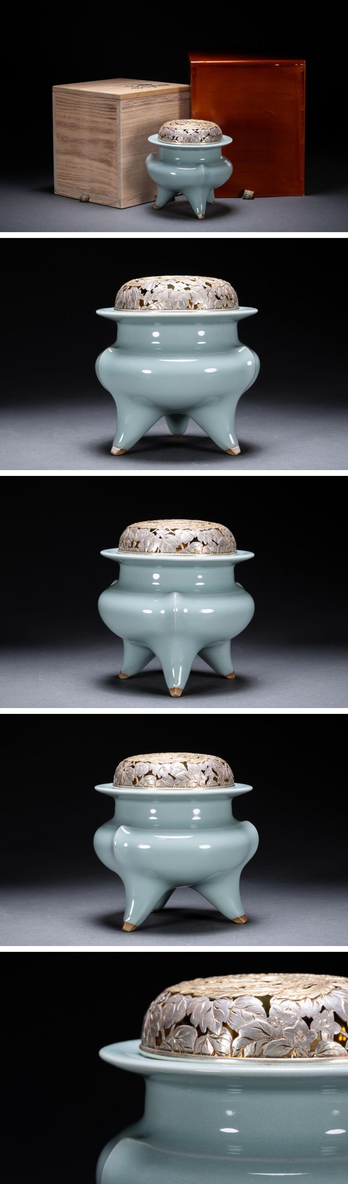 【雲錦】某有名オークション購入「諏訪蘇山」造 青磁 袴腰香炉「松榮堂」造 純銀 鳳凰透 火舎 二重箱 共箱時代コレクション7L10-138S9