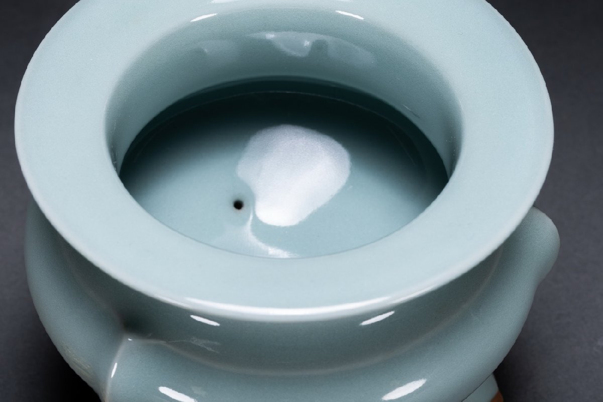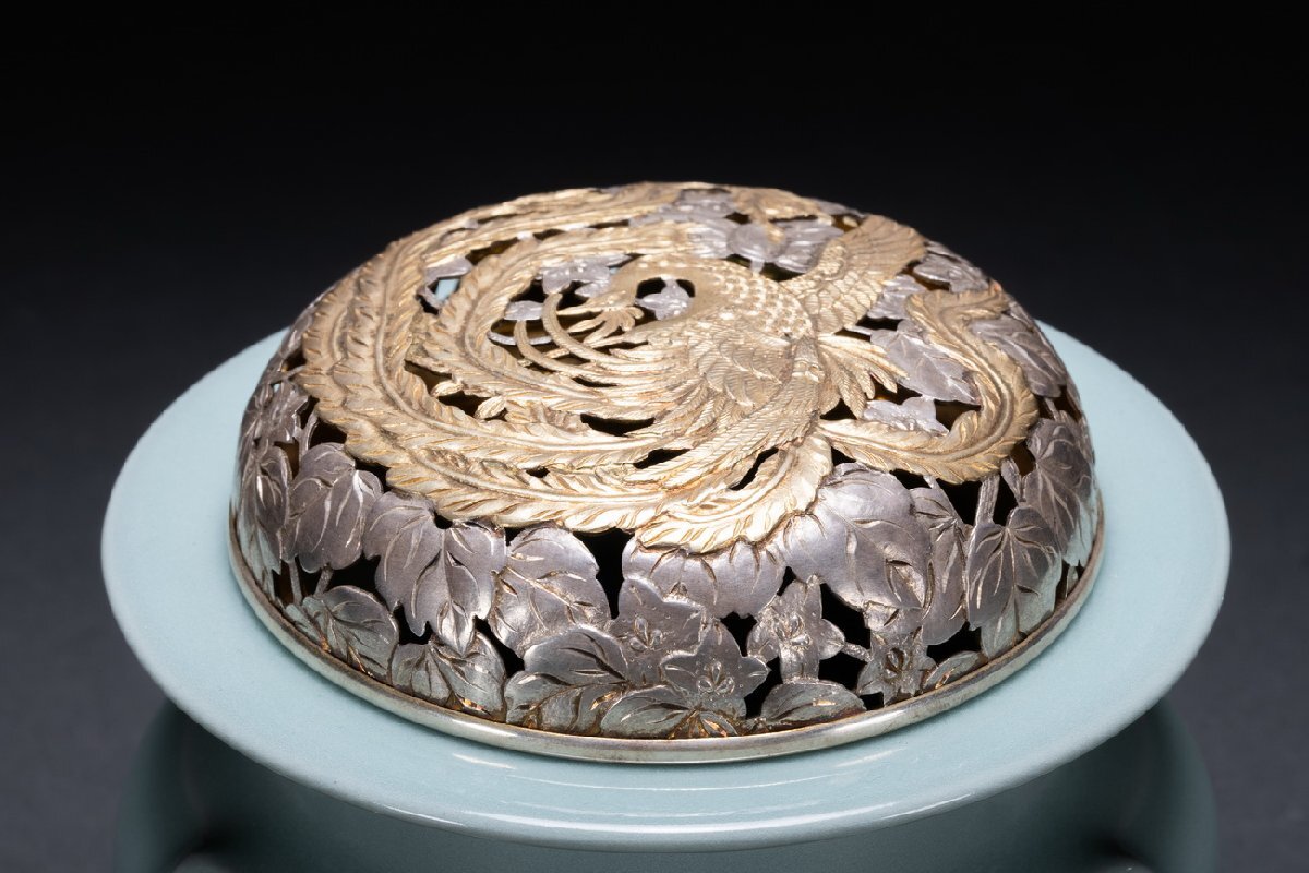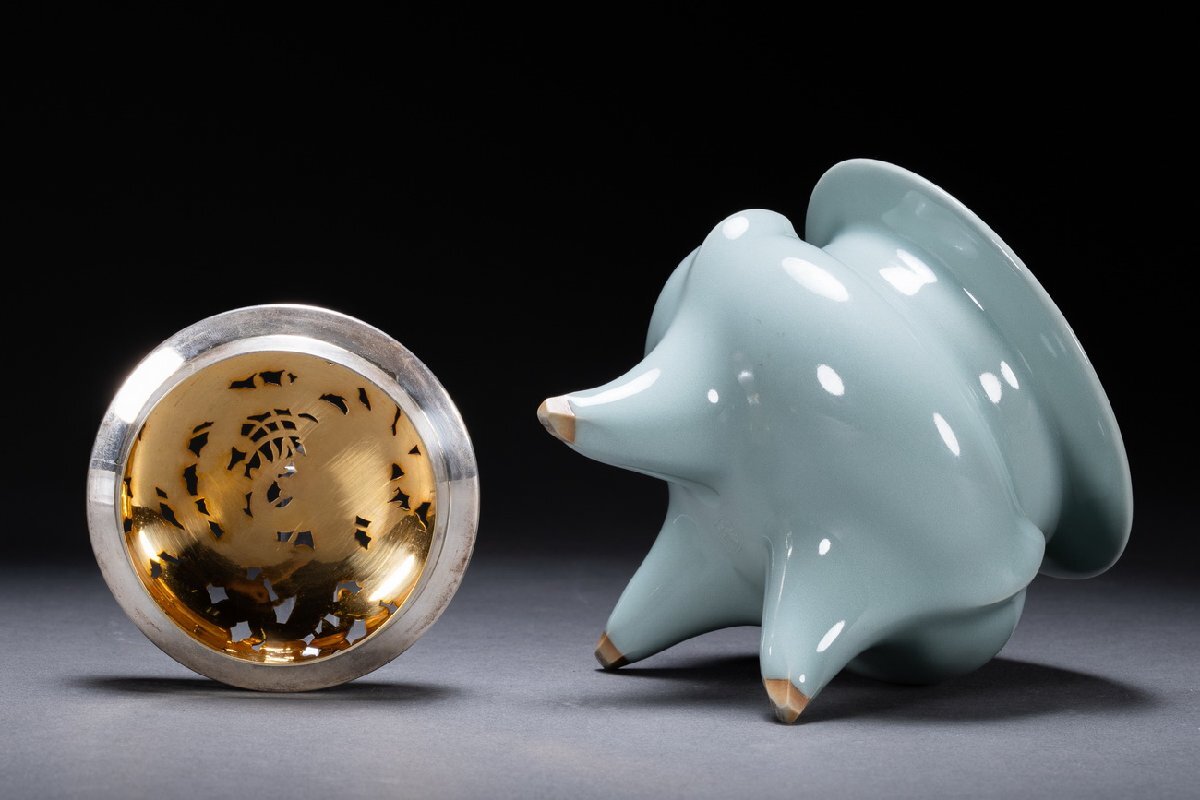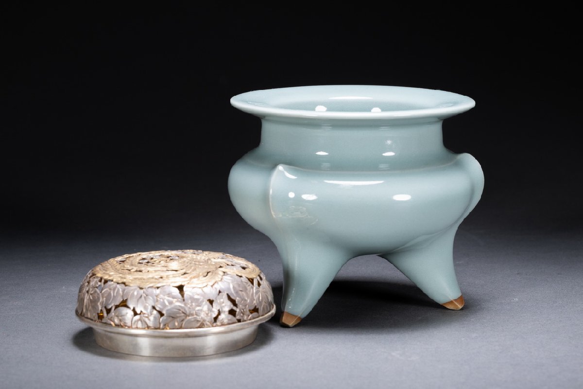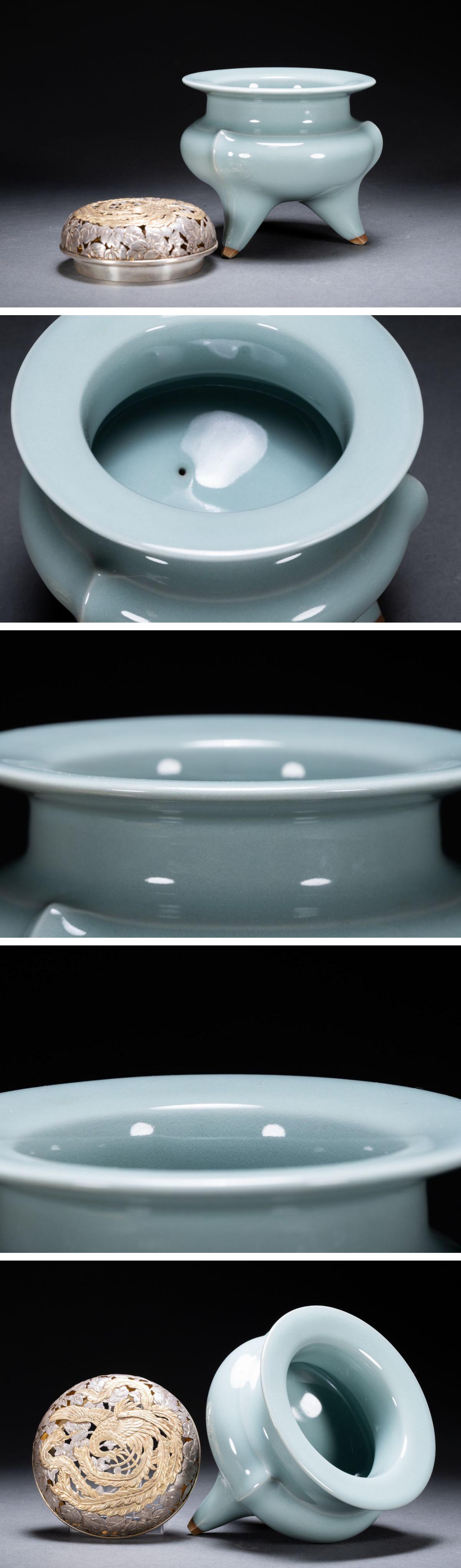 【雲錦】某有名オークション購入「諏訪蘇山」造 青磁 袴腰香炉「松榮堂」造 純銀 鳳凰透 火舎 二重箱 共箱時代コレクション7L10-138S9