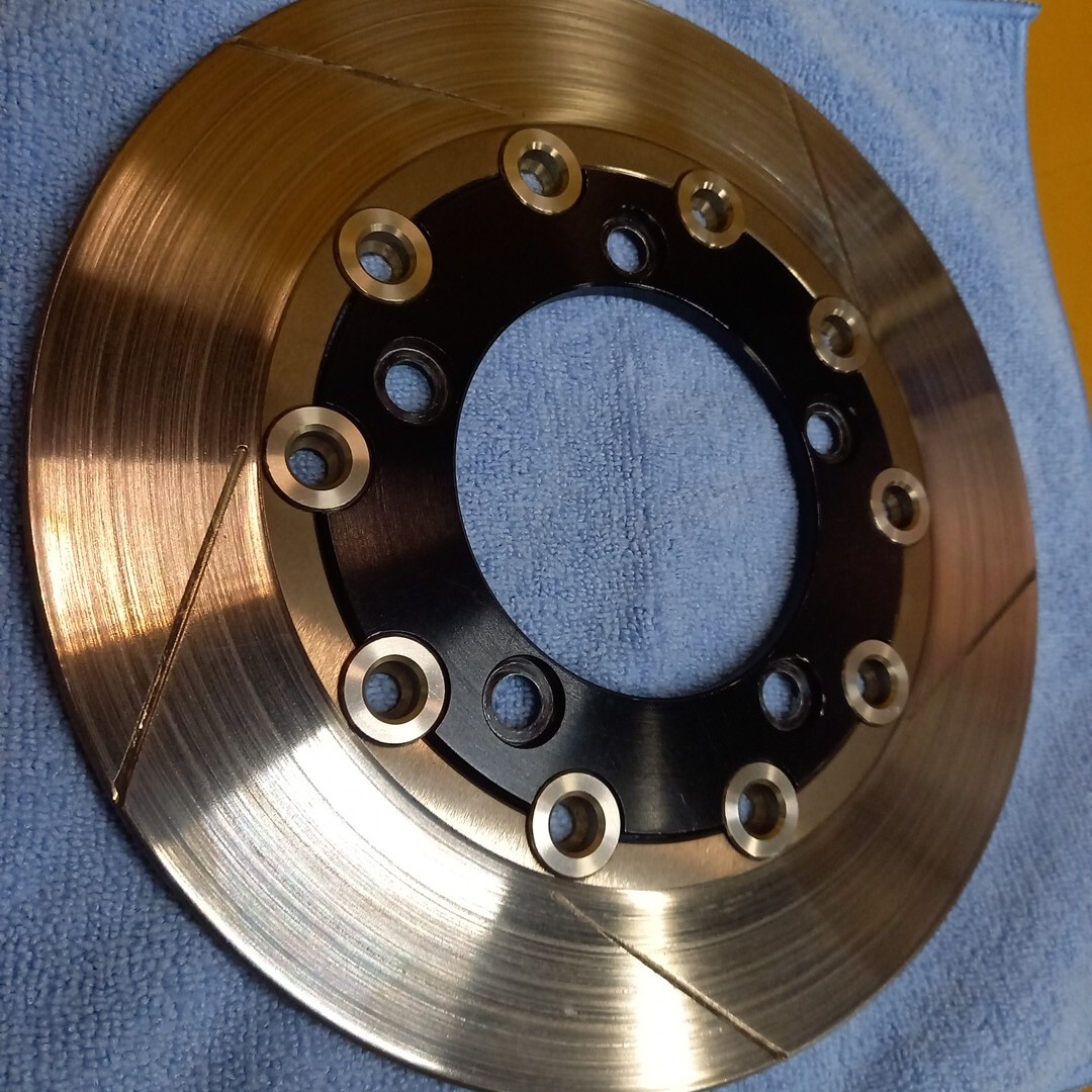 スズキ系車両用外径240、内径89のリア セミフローティングディスクローターです。取り付け寸法はサンスター品番で言うとLR023に該当します。アウターのパッド当たり幅が38㎜位有り、apキャリパーなどパッド面積が大きなキャリパーに対応できるように作られています。(apキャリパーで使用してました)普通に使用していたのですが、アウターが減ってきたため交換したものです。元は5.0㎜厚ですが、薄いところで4.3㎜位まで段減りしてます。素材にどうぞ。| 出价者 | 信用 | 价格 | 时间 |