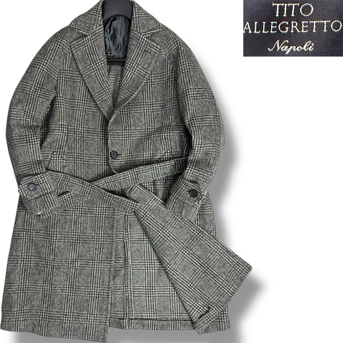 【44サイズ】肩幅計測不可/裄丈81cm/身幅58.5cm/着丈101.5cm/脇下丈47.5cm/第二ボタン身幅58.5cm美品 Aランクティトアレグレット グレンプレイド柄 ベルテッドチェスターコート グレー 44 TITO ALLEGRETTO〈TITO ALLEGRETTO〉のグレンプレイド柄チェスターコート。落ち着いたグレーの色味とクラシックなグレンチェック柄が上品で、ビジネス・カジュアル問わず活躍する一着です。フロント段返り3つボタンのデザインとベルト付きでシルエットを調整可能。裾まで長めのチェスター丈で暖かく、存在感のあるコートです。※品タグがポケット内側にあり、縫い目などでも素材表記が確認できませんが、おそらくウール素材と思われます。【状態】美品(Aランク)【カラー】グレー(グレンプレイド柄)【素材】画像参照(おそらくウール)【購入先】AACD加盟リユースショップにて購入【仕様】・フロント段返り3つボタン・背抜き裏地・センターベント・ベルテッド仕様上品でクラシックなグレンプレイド柄ベルト付きでシルエット調整可能秋冬のビジネス・カジュアルスタイルに最適