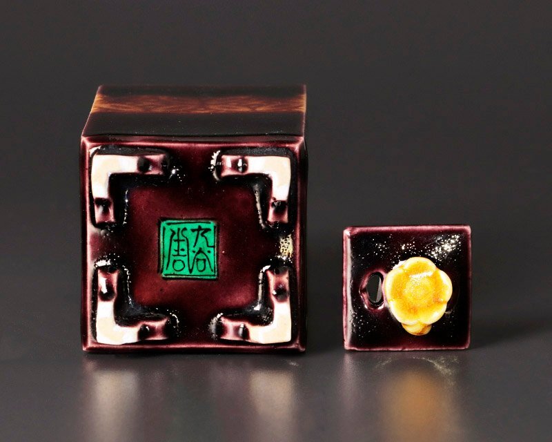 深厚釉の豊かな色合いに引き込まれるような趣があり、摘みに添えられた黄色い花が愛らしく、全体にあたたかみを感じさせる作品です。 ★商品は初代徳田八十吉の作品である事を保証致します。 |