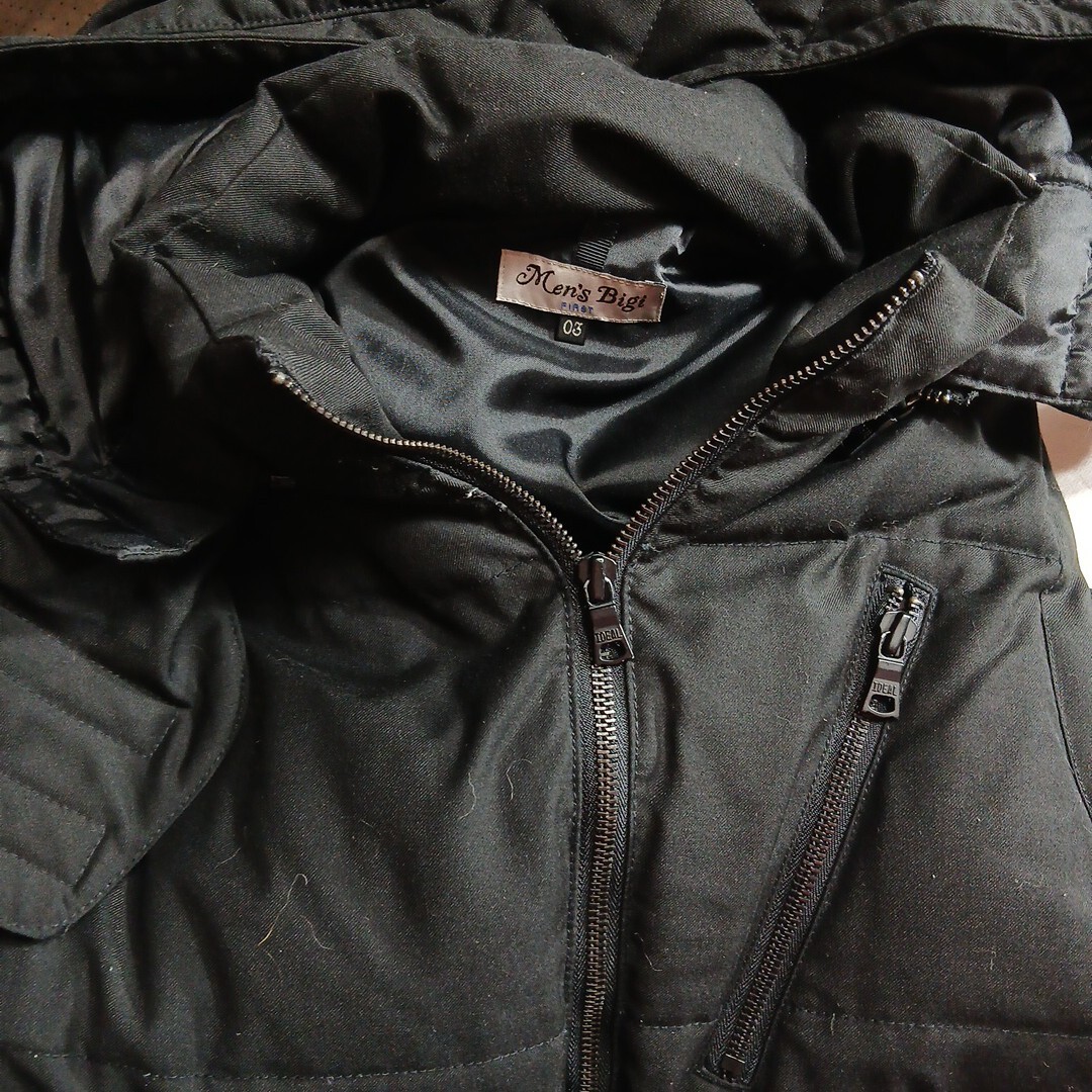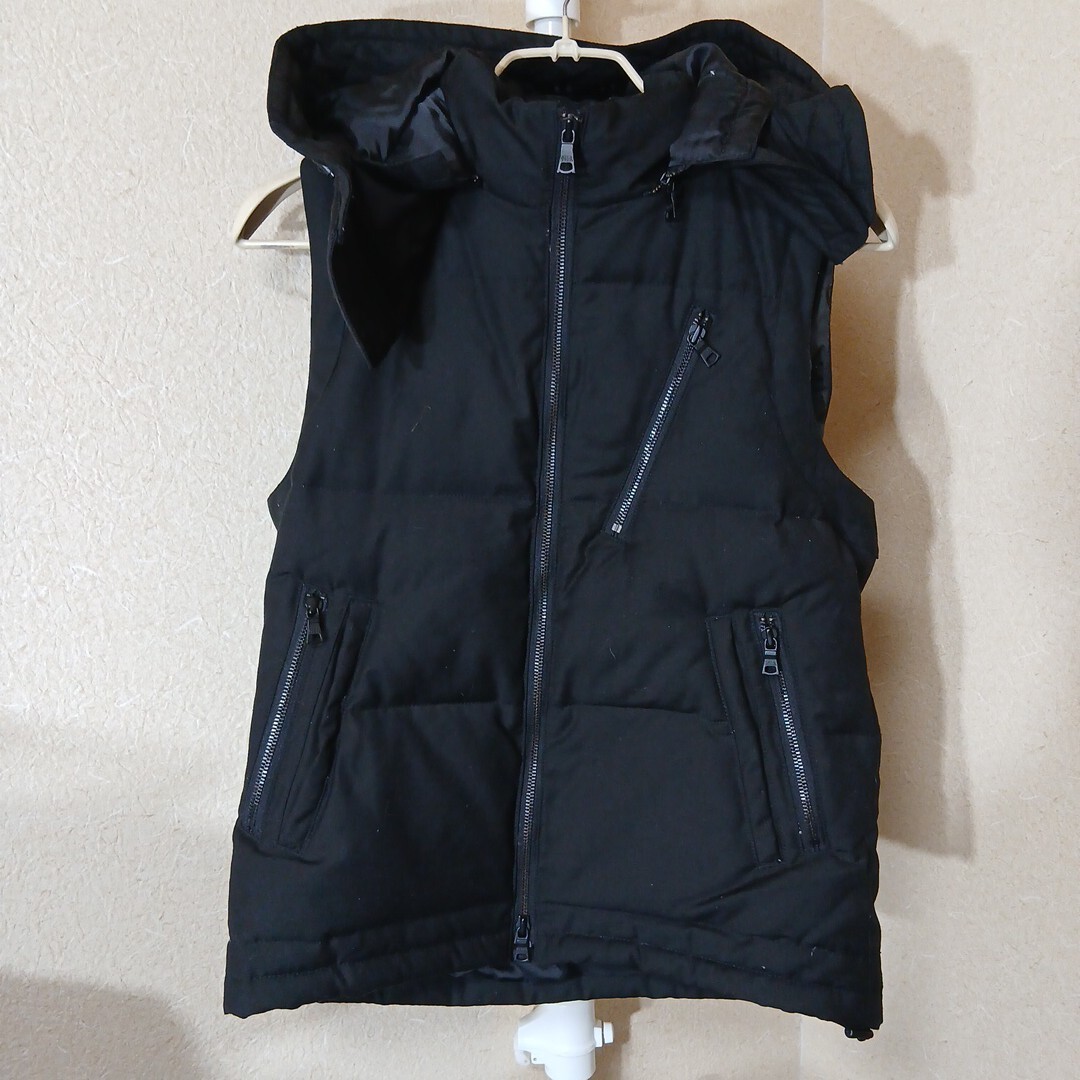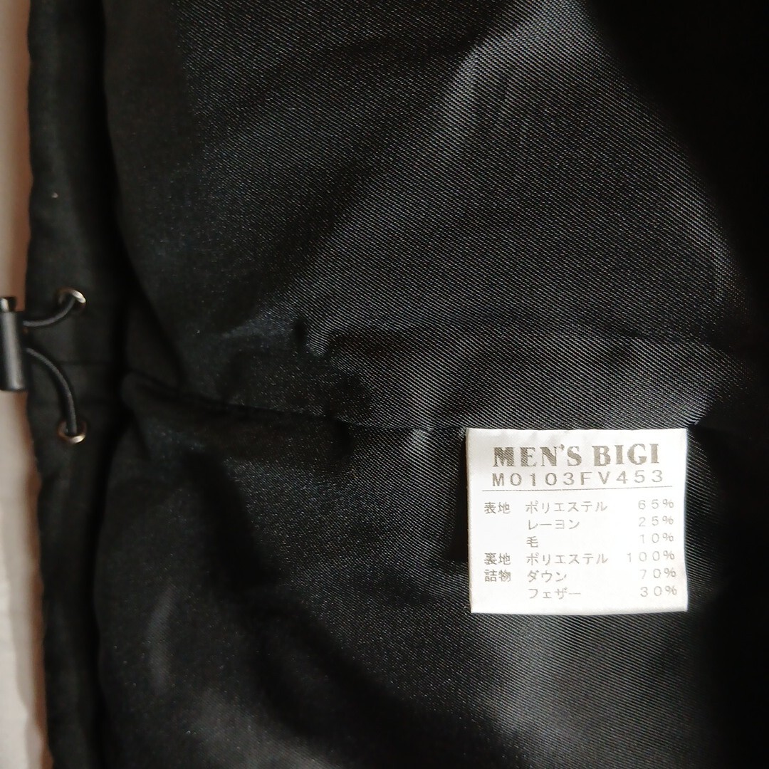 メンズビギのダウンベストです。サイズは03で、実寸でおおよそ肩幅38センチ、身幅49センチ、着丈60センチです。素材は、表地がポリエステル65%、レーヨン25%、毛10%で、裏地がポリエステル100%で、詰め物がダウン70%、フェザー30%です。色は、黒色です。フードは取り外しが出来ます。多少使用感などございますが特に目立つキズや汚れは無いと思います。