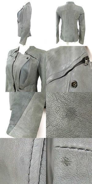 | モードな雰囲気漂う、お洒落なレザージャケット☆ 軽くて柔らかな羊革を使用した逸品です。 ライダース風のデザインでクールな印象に♪ フロントはジップ&釦で開閉。ライダース部分は取り外し可能です。 左右にポケット有り。ヴィアバスストップ取扱い商品です。 肩付近や袖・身ごろ数箇所に製品特有のものと思われますが、 小さなオイル染みのようなものが数箇所ございます。 左袖のひじ付近に約5mmほどの汚れ有り。 着丈約59cm 袖丈62cm 肩幅36cm バスト約84cm 【サイズ】:(ITL40) 【素 材】:(羊革使用 裏地/キュプラ) 【 色 】:(グレー) 【程 度】:(AB) **** 8422-20150824-010 299 003 | ||||