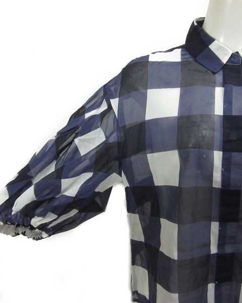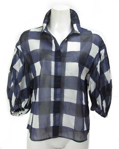 | ふんわりとしたお袖のフェミニンなシアーブラウス。白と紺の涼し気なデザインで、春先から秋口まで活躍してくれます。パンツにもスカートにも、ワンピースの上にプラスしたスタイルもおススメです。 |