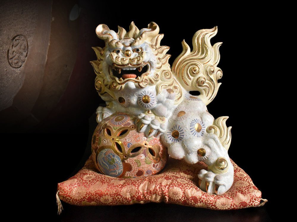 | 商品名 | 【雲】某収集家買取品 大迫力 九谷 色絵金彩花盛上彫刻玉乗獅子 高さ36cm 座布団付 古美術品(置物オブジェ縁起物)DJ983 OTxcf41s |