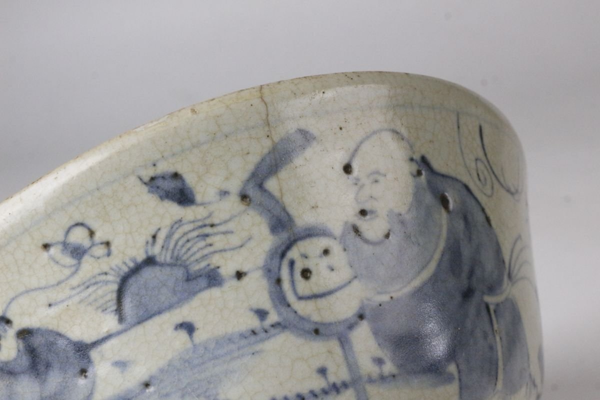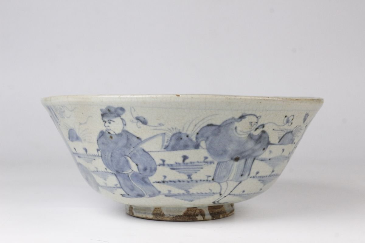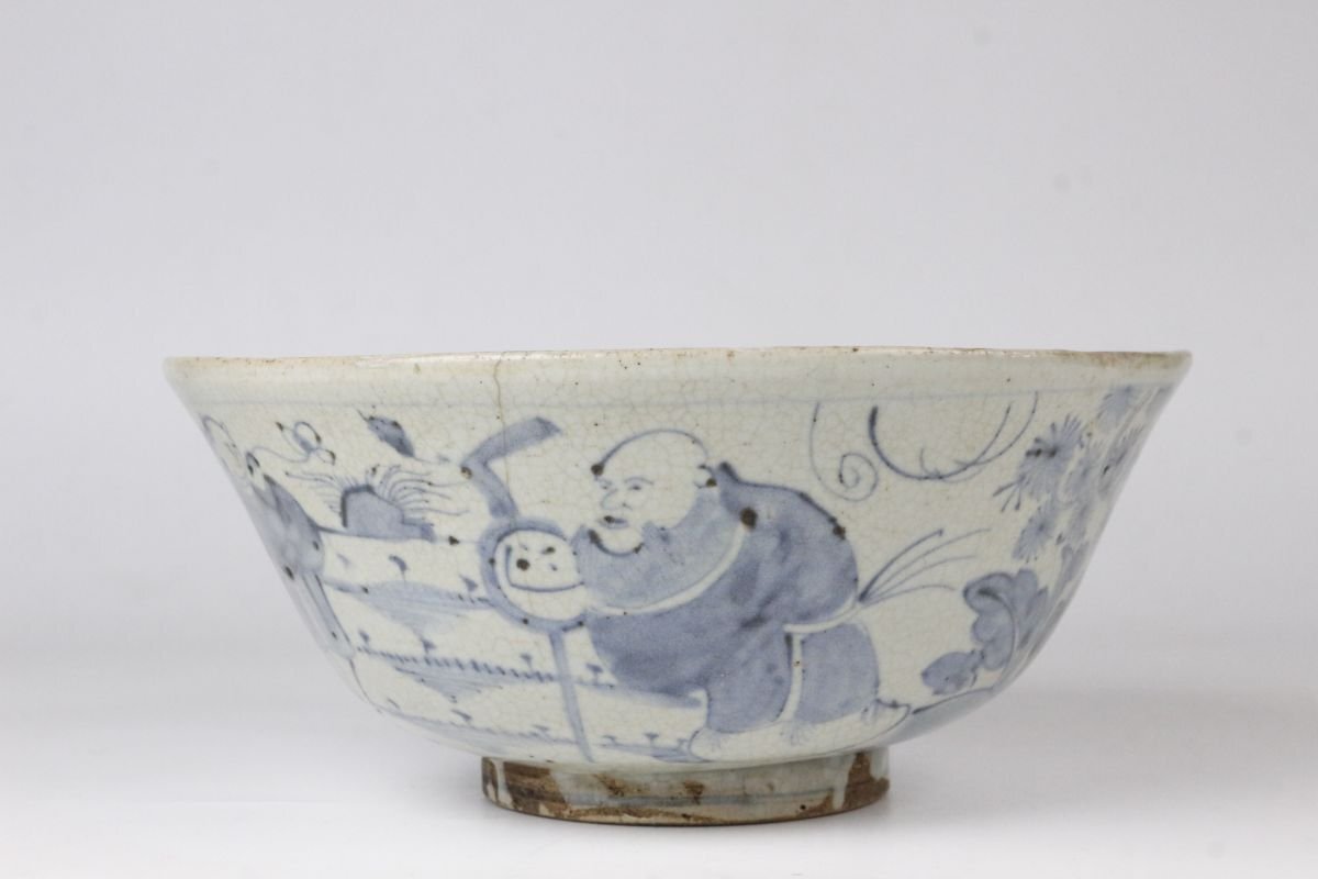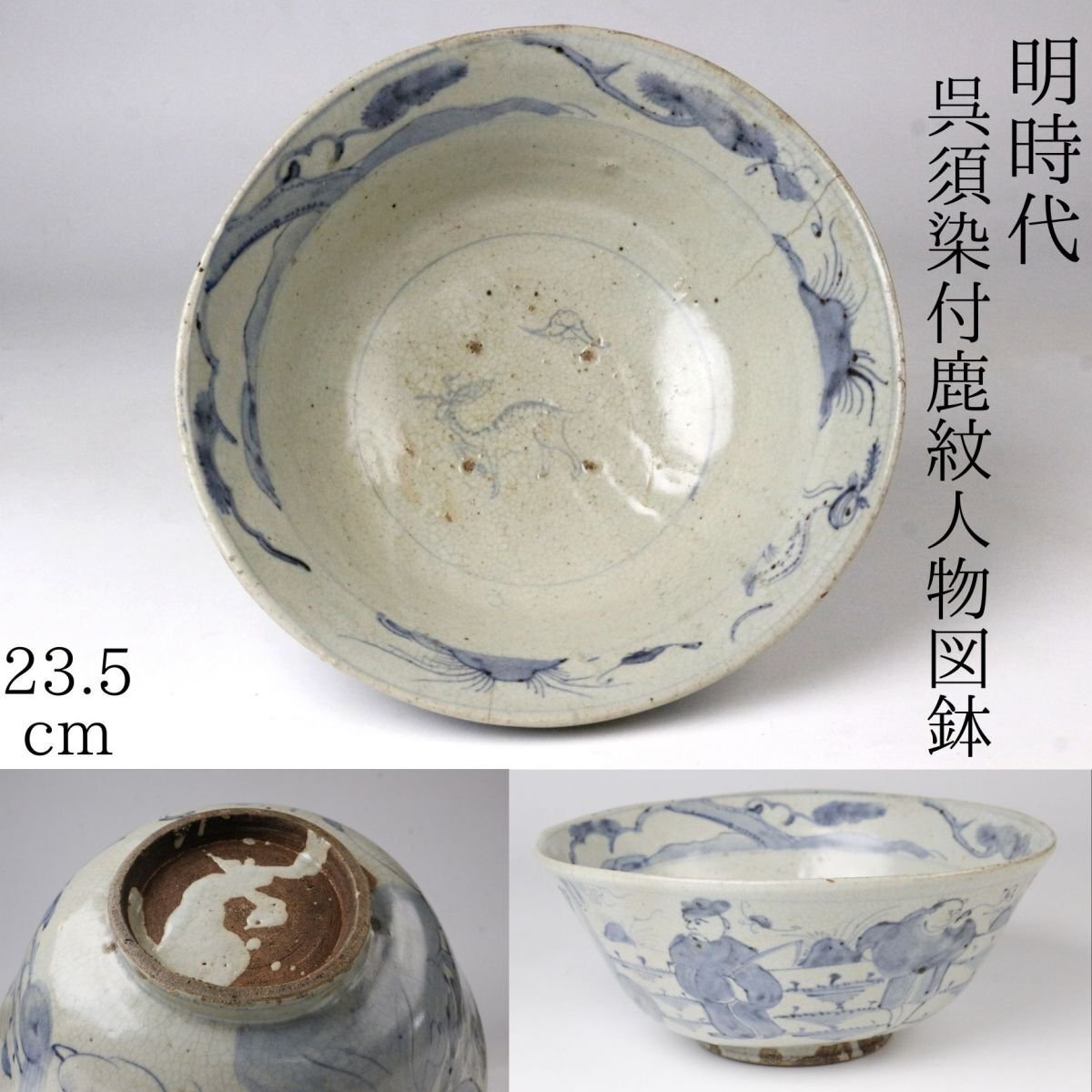 [.QR]25.02 25020542 T* * * 商品詳細 * * * ここでしか出逢うことのできない唯一の美をご紹介させて頂きます。 明時代末期に中国南方の福建省 州窯で焼成された呉須染付のお品でございます。 自由に伸び伸びと描かれた人物と鹿の絵付は趣に溢れています。州窯で焼かれた作品特有の 肉厚な造りがすきっりとしながらも風格の高さを醸し出しています。 まさに古来より茶人に愛された見事な逸品でございます。 この機会に是非お手元にてご堪能下さい。 ■商品内容/ 鉢、箱 ■サイズ/横23.5㎝×高10.5㎝ 箱:横27㎝×高13.5㎝×奥行27.5㎝ ■状態/スレ、傷、にゅう、窯被 箱にスレ、傷、張り物がございます。 ※写真にてご確認、ご了承の上ご入札下さい。