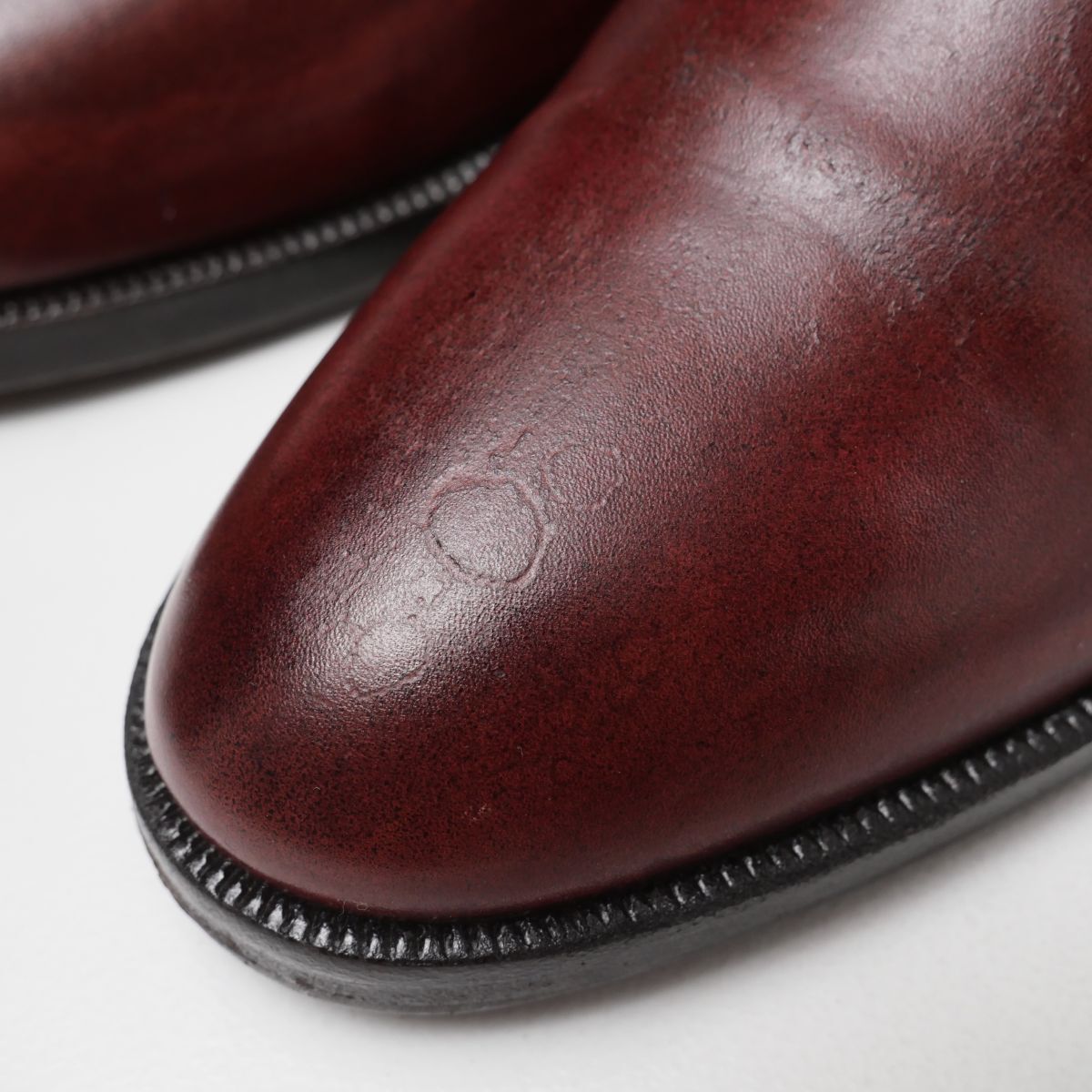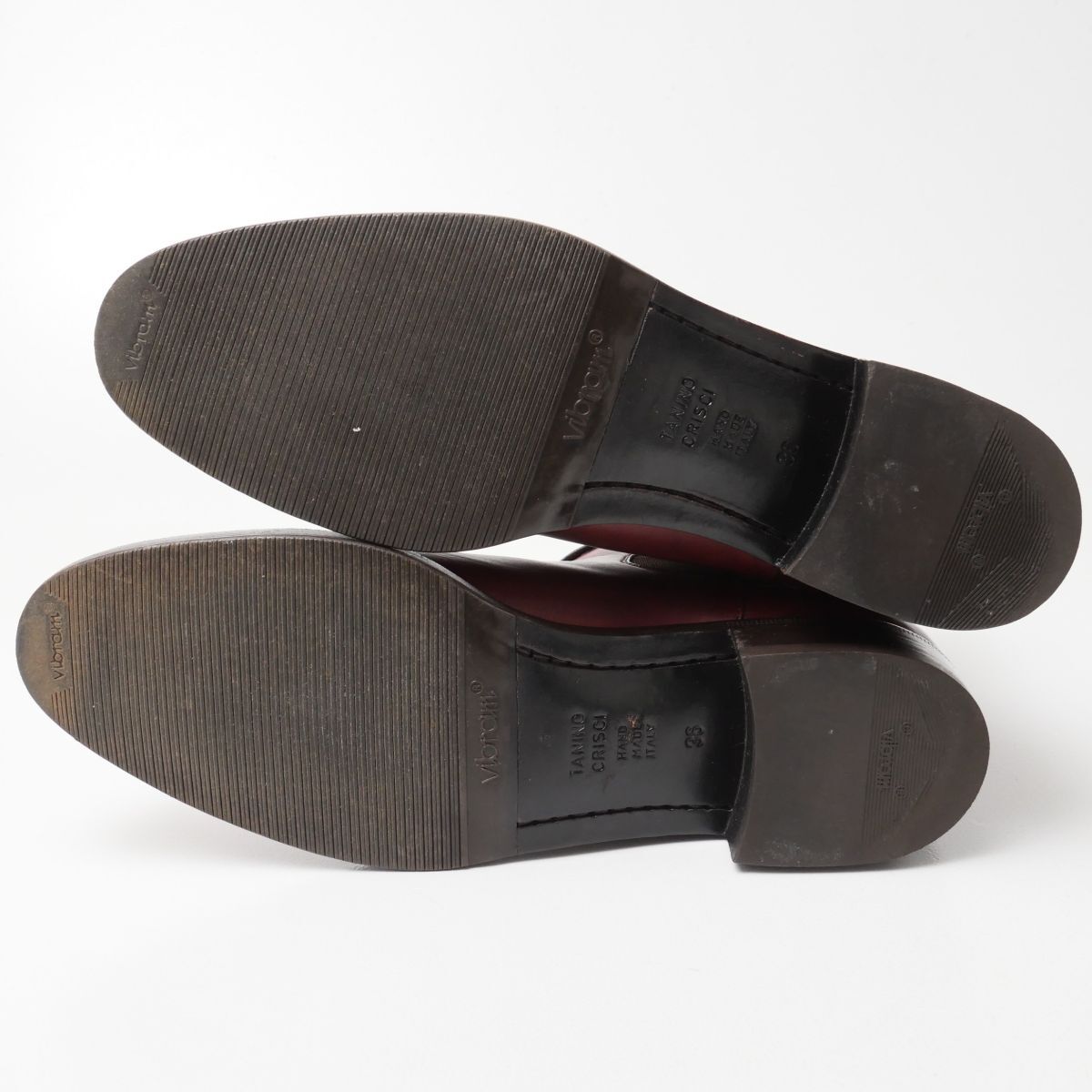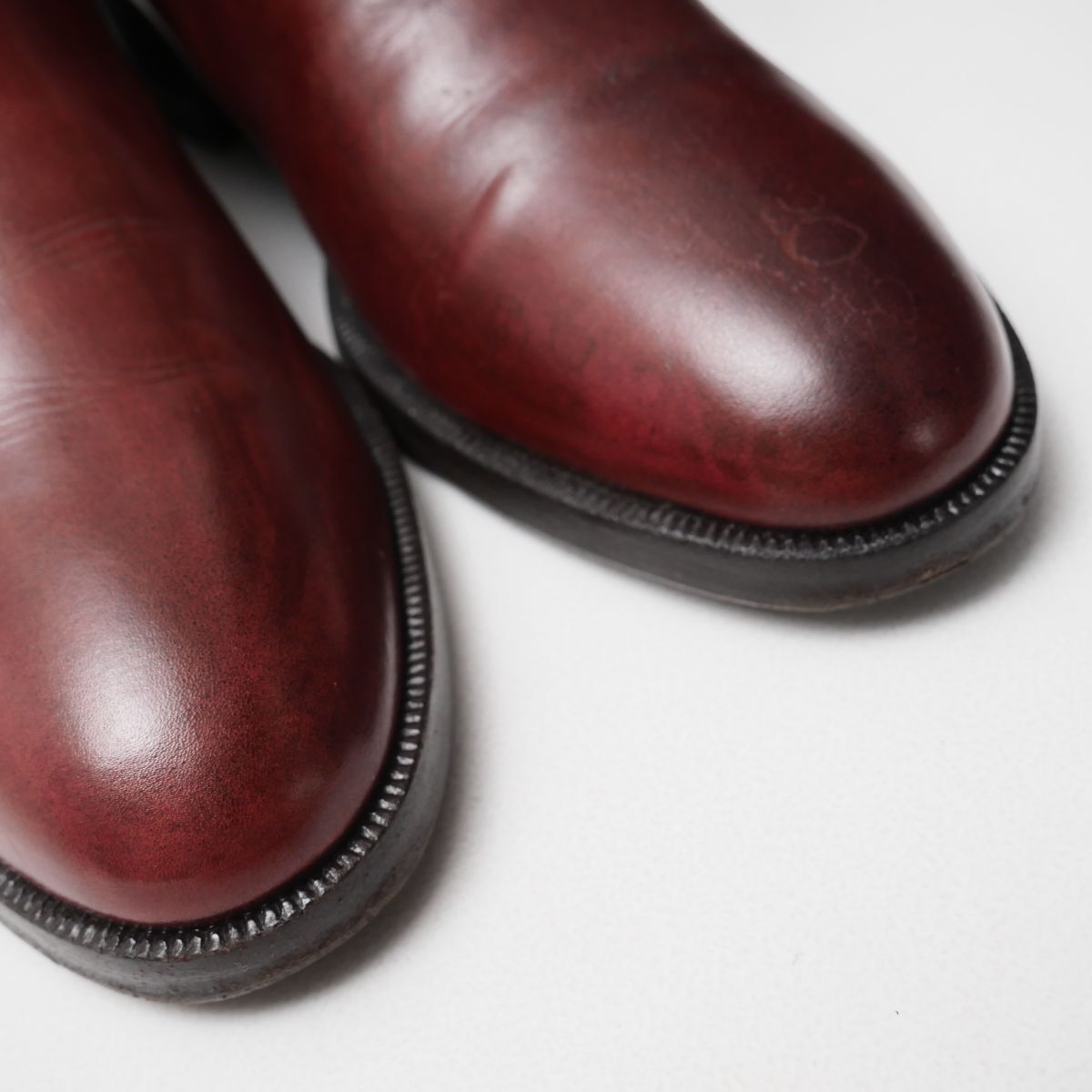 【コンディション詳細】 アッパーに履きジワやシミ、色ムラや汚れ、クラックやキズが所々あり、ライニング・インソールに汚れが見られますが、支障になるようなダメージはなく今後も十分ご愛用いただけるコンディションです。 アウトソールにはビブラムソールの半張りが施されており、トップリフトも交換されております。(画像8参照) アウトソールの減りはトゥで1mm程度、ヒールで4mm程度です。 |