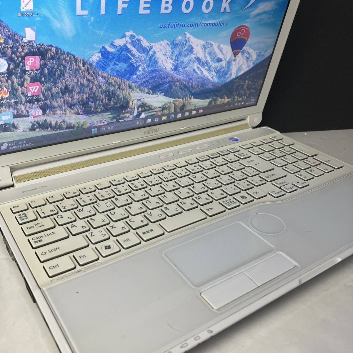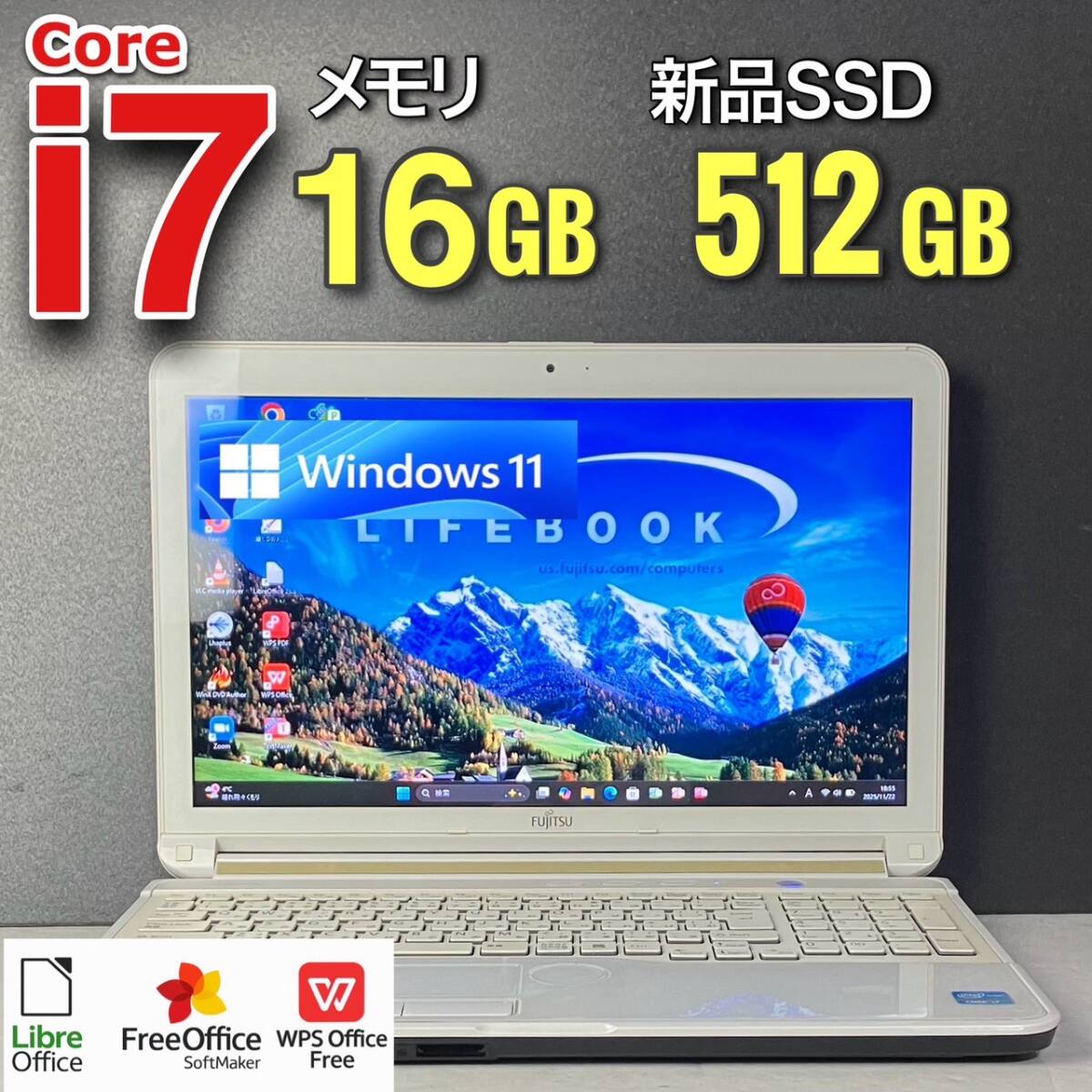 | 【配送商品の中身】 □ノートパソコン本体 (新品SSD、メモリ内蔵済み) □ACアダプタ □延長保証パンフレット 【スペック】 ■メーカー・型番:富士通 AH77/G ホワイト ■インストールOS:最新版Windows11 Pro 64ビット ■CPU:Core i7-2670QM(4コア/8スレッド) ■メモリ:16GB(8GBx2) ■容量:爆速新品SSD512GB ■装備 ●15.6型ワイド(16:9)LEDバックライト付TFTカラーLCD (スーパーファイン液晶) 1,366×768ドット 発色も良く液晶良好★使い勝手がいいオーソドックスなサイズ感です ●無線LAN対応 IEEE802.11a IEEE802.11b IEEE802.11g IEEE802.11n ●有線LAN対応 ●高速USB3.0ポートx2、USB2.0x3 ● HDMIポート搭載 モニターに出力して大画面での作業や動画視聴も可能 ●Webカメラ内蔵 すぐにテレビ電話可能です♪ ■動作確認