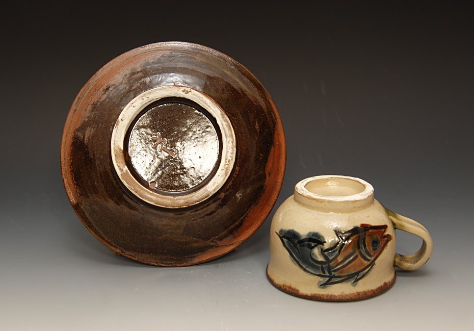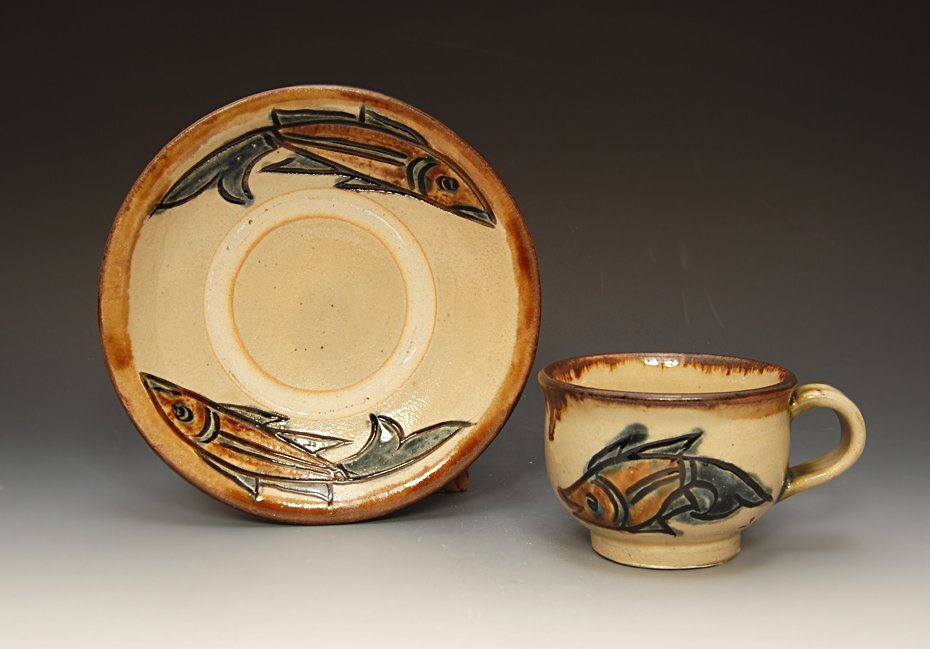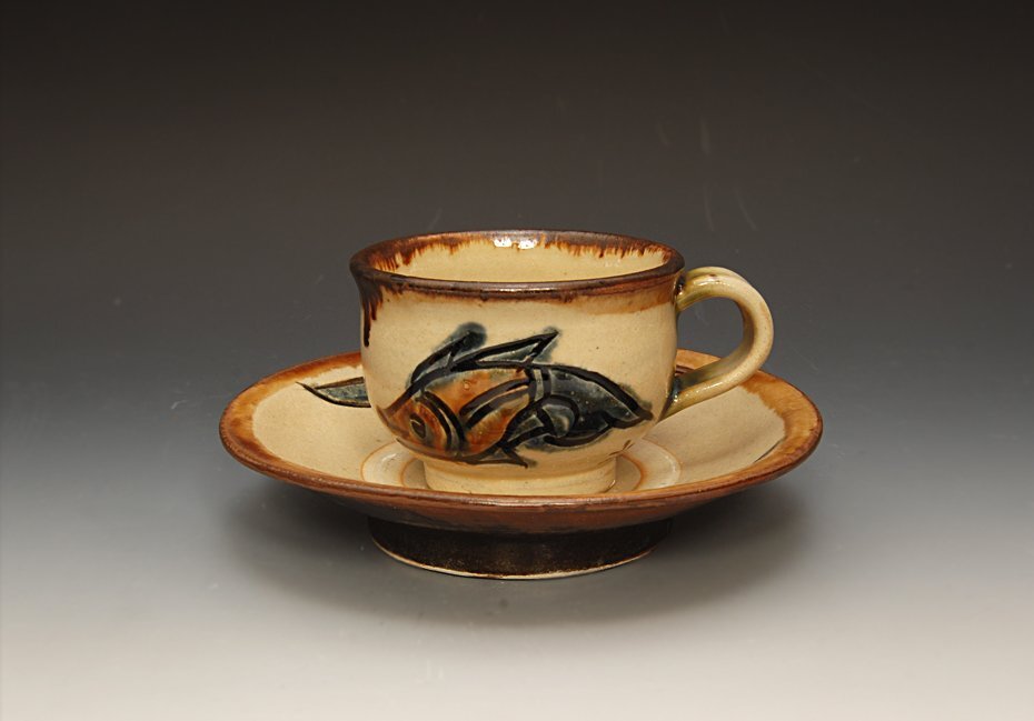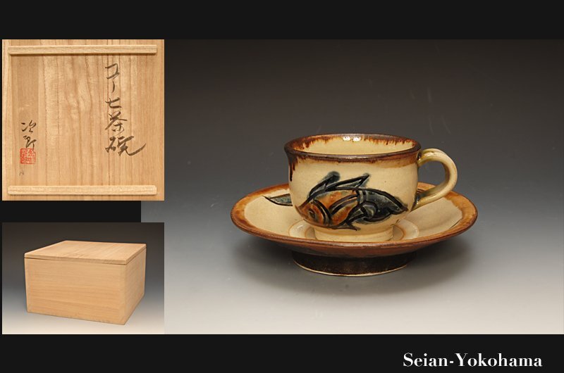 星庵厳選名品企画 人間国宝 金城次郎作 魚文カップ&ソーサー 共箱