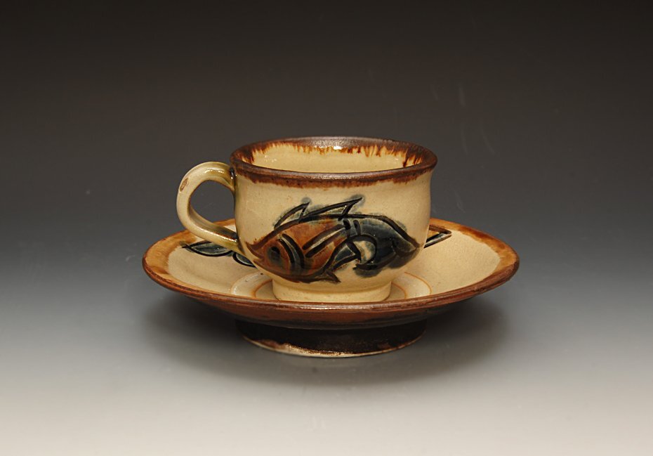 意外と作品の少ないコーヒー碗です丁重な造形と魚彫文の完璧な上がりの作品です。
