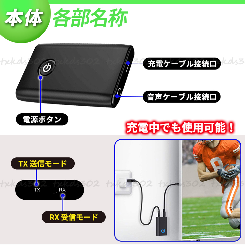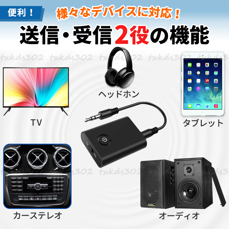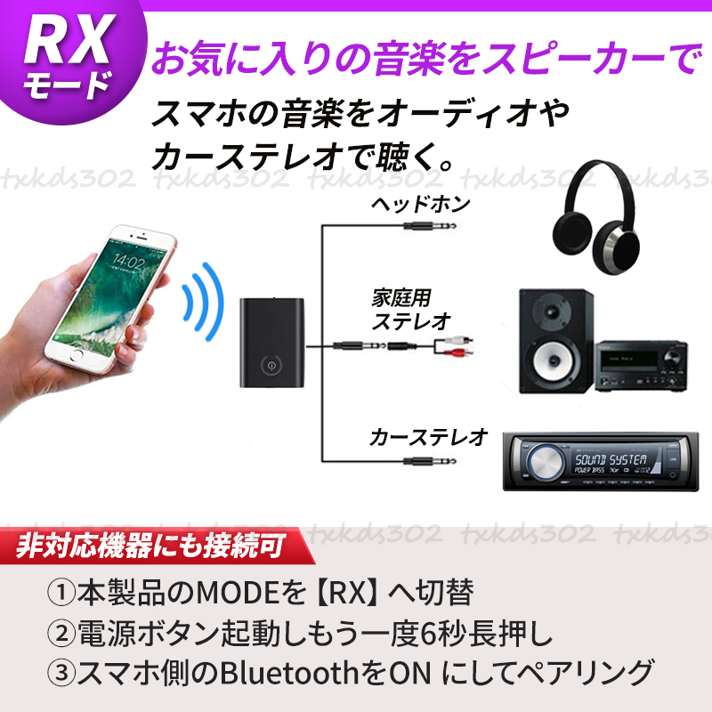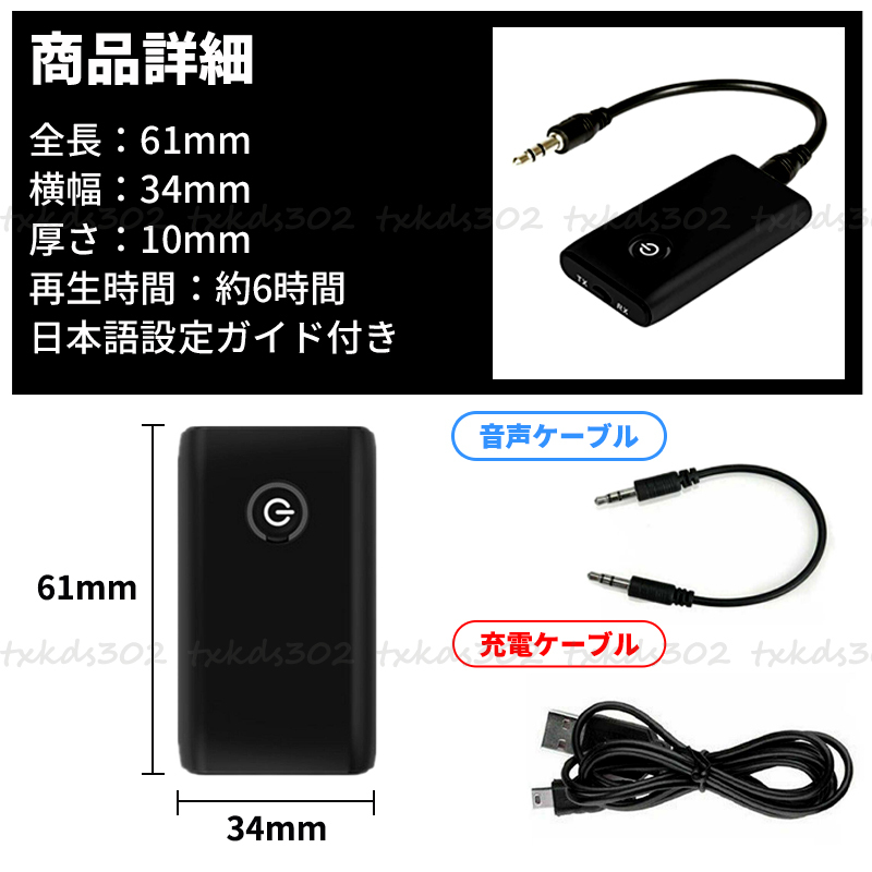 閲覧いただきありがとうございます。 様々なオーディオ機器をBluetoothのデバイスとして使えるようになります。 テレビやゲーム機などをワイヤレススピーカーやヘッドホンと接続。 ●これ1台で送信機・受信機の両方の機能! ・TX(送信)モード : デバイスに本体を接続しスピーカーに高音質なサウンドを送信。 ・RX(受信)モード : スマホ・パソコンからの音声を受信して家庭のステレオやカーステレオ等で聴くことができます。 ●bluetooth5.0搭載!低遅延で音ズレの無い音声出力をサポートします。 ・bluetooth非対応のスピーカーやヘッドホンでもワイヤレス化が可能です。 ・最大電送距離 10m自由に動きながら音楽を楽しむことができます。 【商品詳細】 ・トランスミッター本体 ・サイズ : 61×34×10mm ・音声ケーブル : 50cm ・USB充電ケーブル : 50cm ・再生時間 連続使用時 : 約6時間 薄型でコンパクトなサイズなのでジムでのトレーニングやツーリング等にジャマにならずに快適な音声生活を送れます! ※ご使用前に付属ケーブルで完全に充電してください。 ※送信機としてご利用する時は受信側がbluetooth対応であることを確認してください。 ※TX・RXのモード切替は必ず電源offの状態で切り替えて下さい。 ※非防水です。雨や汗にご注意下さい。 ■全国送料無料 ■発送方法 ゆうパケットポストmini 毎週 月・水・金曜日が発送予定日となります。 約4~5日でポストに投函され完了となります。 |