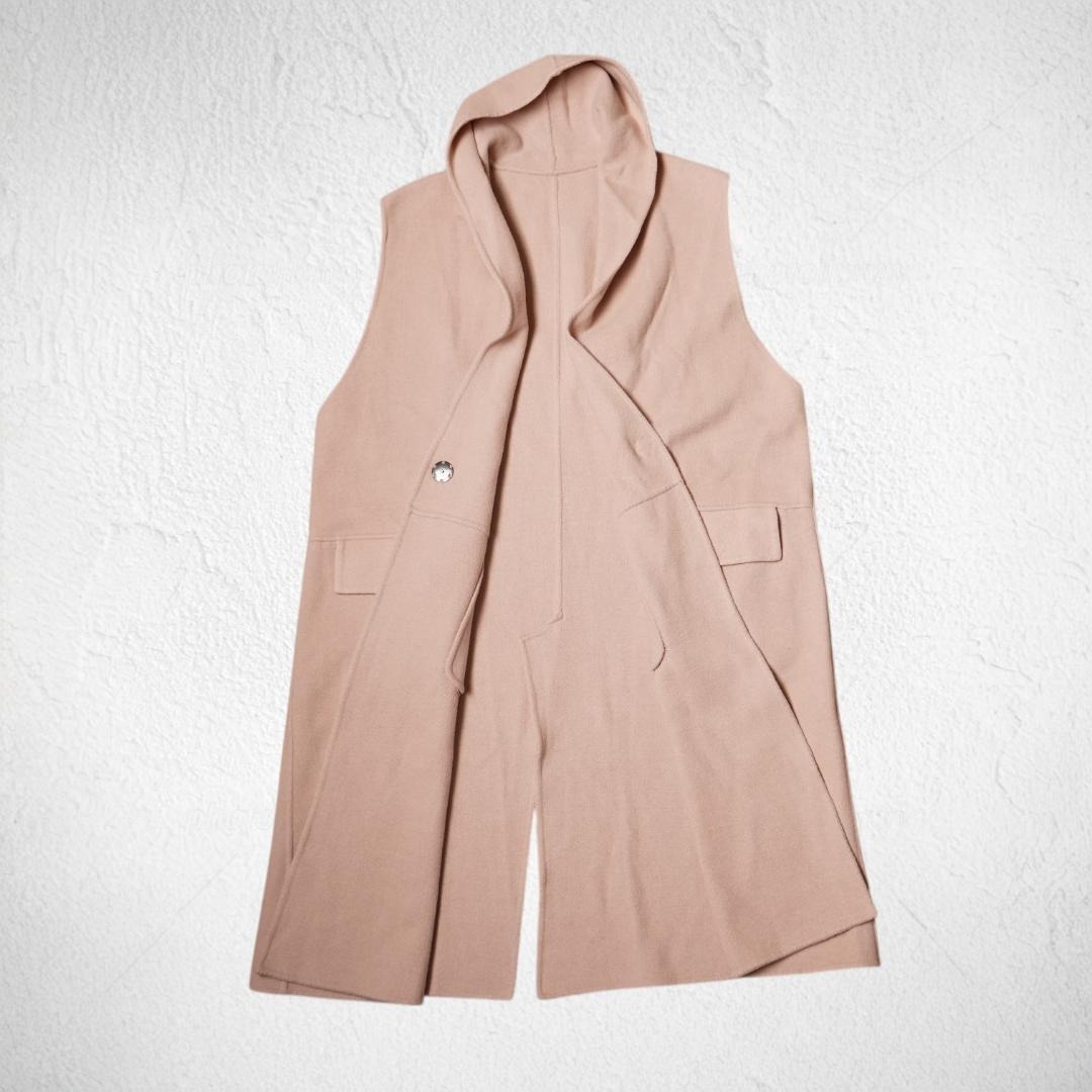 滑らかな生地で仕立てたフード付きのロングジレです。