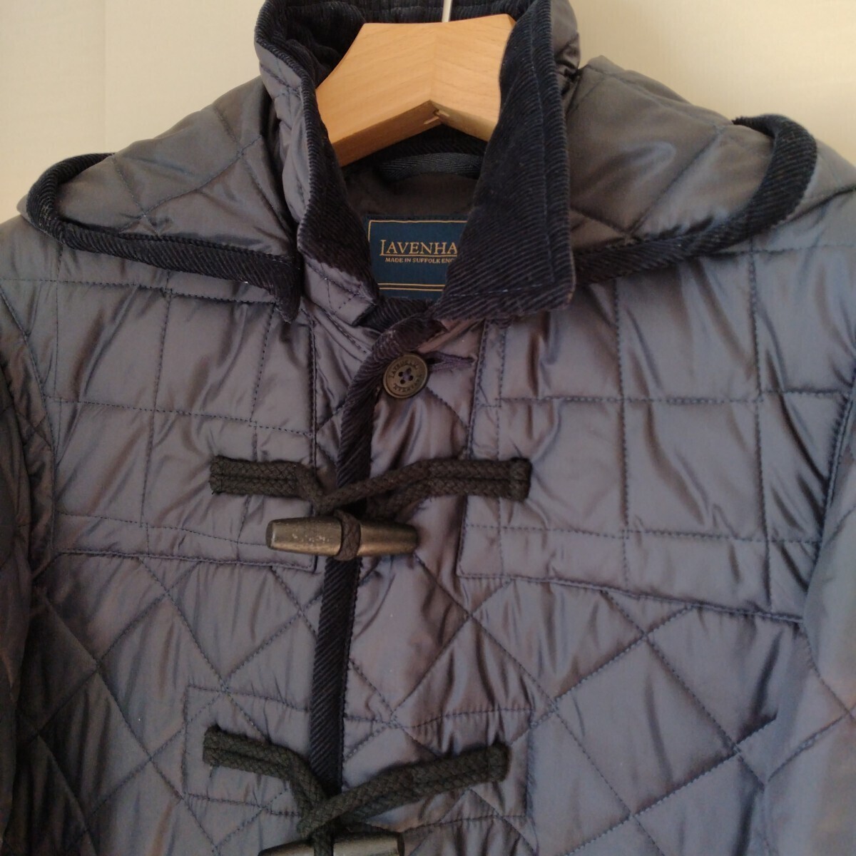 セレクトショップ「SHIPSシップス」が創業45周年を記念して、イギリスのキルティング製品ブランド「LAVENHAMラベンハム」に別注した、着脱可能なフード付きダッフルコート。ポリエステルを使用した軽い着心地で、カジュアルからスーツスタイルまで幅広く活躍するアイテムです。カラーはソリッドネイビー。サイズは38(М)。身幅59cm、肩幅45.5cm、着丈98cm、袖丈61cm(少し詰めました)。素材は生地、中綿ともにポリエステル100%、襟等別布がコットン100%。フロントのトグルは木製です。イギリス製。大小のスペアボタン付き。気になるようなキズや汚れの無い美品ユーズドです!ドライクリーニング済。