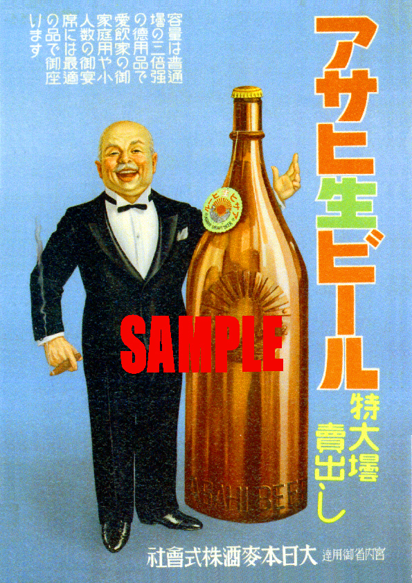 | 昭和14年(1939)のアサヒビールの広告のレプリカ(複製品)です。 実際の商品には「SAMPLE」の文字はありませんし、画質も上質です。 材質は厚手の高品位マット紙、大きさはA4サイズ、ラミネート加工がしてあります。お手軽な価格でレトロな雰囲気を演出します。店舗のディスプレイや、お部屋、ガレージなどにいかがでしょうか? 額縁に入れても素敵です。 |