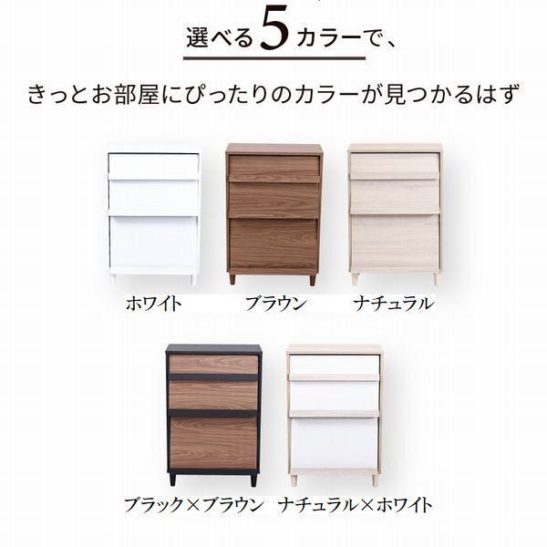 | 【カラー】 ホワイト、ブラウン、ナチュラル、ブラック×ブラウン、ナチュラル×ホワイト 【サイズ】 <外寸> 幅60×奥行35.5×高さ90(アジャスター80.5)cm <内寸> フラップ部1段目:幅55×奥行1.5×高さ13.5cm フラップ部2段目:幅55×奥行1.5×高さ20.5cm フラップ部3段目:幅55×奥行1.5×高さ36.5cm フラップ扉内1段目:幅52×奥行24.5×高さ31cm フラップ扉内2段目:幅52×奥行24.5×高さ32cm 【材質】 <ホワイト> 本体:プリント紙化粧合板 天板・扉:合成樹脂化粧合板(PVC) 脚:天然木 <ブラウン、ナチュラル> 本体:プリント紙化粧合板 脚:天然木 <ブラック×ブラウン> 本体:プリント紙化粧合板 天板:合成樹脂化粧合板(PVC) 脚:天然木 <ナチュラル×ホワイト> 本体:プリント紙化粧合板 扉:合成樹脂化粧合板(PVC) 脚:天然木 【耐荷重】 天板:(約)10kg以下 フラップ扉1~2段目:(約)1.5kg以下 フラップ扉3段目:(約)2.5kg以下 扉内固定棚:各(約)5kg以下 【生産国】 中国 【梱包】 サイズ:82×42×14.5cm、重量:14.9kg 【その他】 ・背面化粧なし ・脚裏フェルト付き ・アジャスター付き 【組み立て品】 お客様による組み立てが必要です。 【ご注意】 ・サイズ、重量は概算です。 ・商品カラーはご使用のモニターによって実際の明るさや色と異なって見える場合がございます。 |