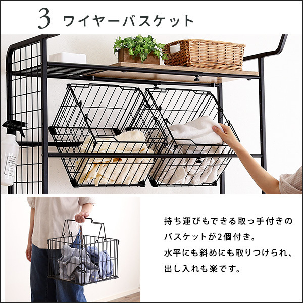 【ポイント】 幅は65cmから90cmまで無段階に調整できるので大型洗濯機にも対応できます。 洗濯物を一時的にかける時に便利なハンガーバーが付いています。 棚板裏面には、ズレ落ち防止ストッパーが4つ付いているので、万が一の落下を防ぎます。 持ち運びできる取っ手付きのバスケットが2個付きです。 棚とバスケットの高さは12段階調整可能です。 |
