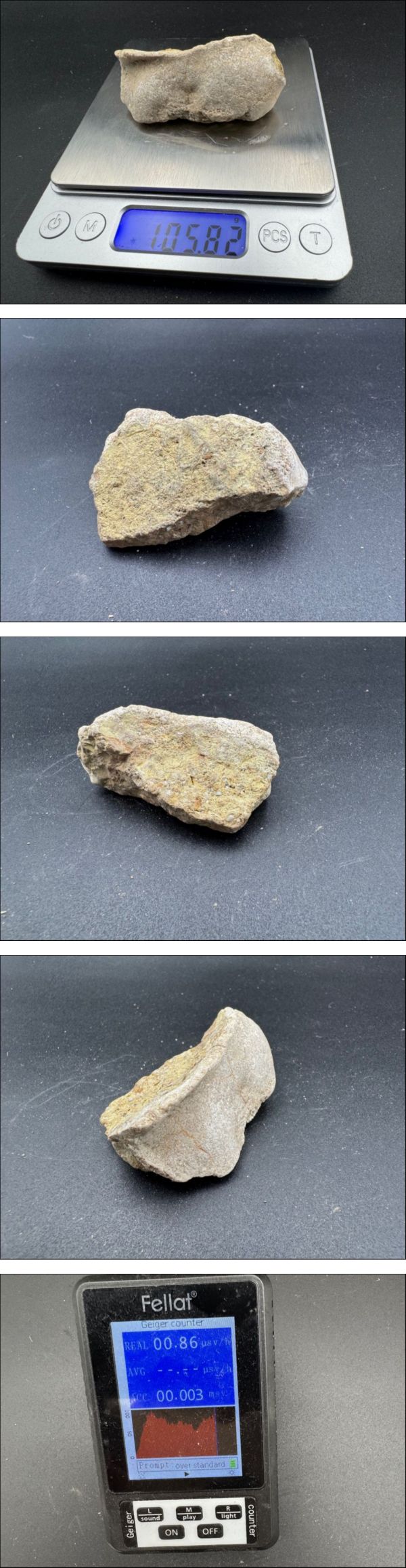 | 【希少】台湾北投石 105g 北投石 台北北投石 北投温泉 ラジウム温泉 玉川温泉 大変貴重な鉱石です。 下記ウィキペディアより、 出典: フリー百科事典『ウィキペディア(Wikipedia)』 北投石(北投温泉産出)。国立台湾博物館収蔵 北投石(玉川温泉産出)。秋田大学附属鉱業博物館収蔵 北投石(ほくとうせき、英語: hokutolite)は北投温泉で発見された鉱物で、学術的には独立種とはいえず「含鉛重晶石」と呼ばれ重晶石の亜種として扱われる。世界でも台湾台北市北投区の北投温泉と日本秋田県の玉川温泉[注釈 1]からしか産出しない。 1905年(明治38年)に地質学者岡本要八郎が台北州七星郡北投街の瀧乃湯で入浴した帰りに付近の川で発見した。その後、この鉱物がラジウム等を含み放射性を持つ北投温泉独特の鉱物(後に玉川温泉で産出する物も同じ物であると認定された)であるとされた。1913年(大正2年)に東京帝大の鉱物学者神保小虎によって命名され、1933年(昭和8年)に台湾総督府によって天然記念物に指定された。 玉川温泉産出のものは神保小虎によって北投石と同じものであると認定される以前は澁黑石と呼ばれていた[2]。菅沼市蔵は、玉川温泉産の北投石を区別するため、「秋田北投石」、"Akita Hokutolite" と表記している。 台湾(中華民国)でも、2000年に「自然文化景觀」に指定されている。 北投石の組成は (Ba,Pb)SO4 で、およそBa:Pb=4:1の割合で含まれる。放射性のラジウムを大量に含む温泉沈殿物重晶石(硫酸バリウム)である。 岡本が北投石を発見してから100年目にあたる 2005年に、台北市において北投石発見100年を記念する国際会議が開催され、日本から30人以上が参加した[5]。 北投石の成分分析 1908年3月、東京帝国大学理学部(当時は東京帝国大学理科大学と呼ばれた)の垪和為昌は神保小虎教授から北投石の成分分析を依頼された。この分析を当時化学科の1年生だった飯盛里安、柿内三郎、靑木芳彦の3名の学生に命じた。この際、垪和はこの鉱物にウランを含んでいないか綿密に調査するように指示を与えた[6]。飯盛によると、ラジウムを含む鉱物に通常含まれる親核種のウランが検出されなかった。方法を変えて再三再四試みたが、それでもウランは検出されなかった。これについて垪和は「この鉱物は水成鉱物であるからラジウムだけが偶然ウランから離れて沈積したものであろう」と見解を述べた[7]。斎藤信房はこれは今日から見ても卓見であろう、と述べている[8]。この分析値は日本鉱物誌第二版に掲載された。飯盛はこの分析によって放射化学に興味を持ち、以後放射化学への道に進むことになった[7]。 北投石中のラジウム含有量は1929年に吉村恂が測定した。結果は北投温泉産のものは1.73×10-7% 玉川温泉産のものは1.22×10-7% であった[9]。飯盛によると、この鉱物が放射平衡にあるウラン鉱物であると仮定すると北投温泉産のものはウランをUO3として約0.61%[注釈 2]含むはずであり、平衡に達していなければさらに多くのウランを含むはずなので、化学分析で十分に検出可能である。しかるに垪和の予想に反してウランが検出されなかったので、垪和は慎重を期して3人の学生に分析を命じてその平均値を採用し、日本鉱物誌に掲載した[7]。下表は日本鉱物誌第2版 (1916年) に掲載された飯盛らによる北投石(北投温泉産)の分析結果[11]。この分析結果は、のちの研究者たちに高く評価されている | ||