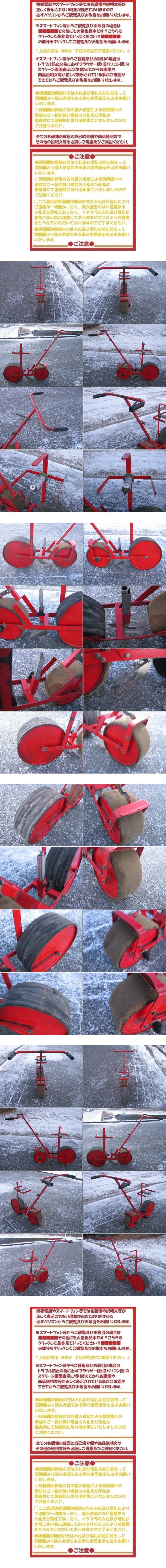●日本プラントシーダー テープシーダー 型式不明 の出品です。 ■本体外寸 奥行 約940㎜ × 横幅 490㎜ × 高さ 約730㎜ (画像1の状態にて) ■スケルにて計測していますので絶対値ではありません。 (※ハンドル&各部各所の最大張り出し部分を含んでおります。) ★こちらの 日本プラントシーダー テープシーダー は ヤマト運輸 の 宅急便 の 送料着払いのみにて 200サイズ 内で発送依頼いたしますのであらかじめご了承ください。 (※送料はヤマト運輸のホームページにて各自お調べください。送料の質問等には一切返答やお答えいたしませんのであらかじめご了承ください。) (※送料はヤマト運輸のドライバーさんから落札品をお受け取りの際に送料分のみをお支払いください。送料着払いとなりますのでご了承ください。) ●発送時の荷造りの制限上や落札品の破損等を防止の為に他の落札品との同梱は不可能となります。いかなる場合でも単品づつの発送となりますのであらかじめご了承ください。 (●重要:ヤマト運輸の場合ではヤフーオークション内で購入及び落札した物は規定上にて保証の対象外となり、その為に発送時による破損や紛失等の保証は一切ございませんのでご注意ください。) (●重要:過去に当方で購入及び落札した物がお客様の手元に届き開封してみたら破損しており使い物にならなくなっていた事がありましたがヤマト運輸側では一切保証してくれませんでした。) (●重要:ヤマト運輸側で保証はしませんが当然ながら出品者の当方側でも保証はしませんので購入者側の完全自己責任となりますので十分ご理解いただいた上にてご考慮及びご検討ください。) ▼ヤマト運輸→■■■■■ヤマト運輸のホームページ■■■■■ ●旧農家さんの方から不用という事で譲られました。 ★地元でも定番な機種となります。 ●わりとスタンダードな機種ですが売切ります!! ★値引き交渉等は一切考えておりませんのであらかじめ前もってご一報いたします。 ●前所有者さんの方が離農に伴い今後使用する機会がない為に譲られたものとなります。 ●メーカー名が見あたりませんがおそらく日本プラントシーダーの製品かと思われます。間違っていたらスミマセン・・・。 ■キズ&サビ&汚れ&色剥がれ&使用感等が見えます。 ※当方農家さんではありませんので、引き取り後に実際に現場や畑での実演チェック等は一切しておりません。 ●前所有者さんの方が何の作物用へ使用されていたのかは不明ですので各画像にてご判断をお願いいたします。 ●譲られた物ですので各パーツ類にはそれなりに使用感やヘコミや曲りやキズや色剥がれ等が見える部分があります。 ■前後にある車輪に装着されている黒色のパッドやスポンジには共にそれなりに使用感や痛みやホツレやシミや欠損や粘着物跡や汚れ等が見えます。(追加画像参照) ●ハンドルは取り外しが可能です。 ●各自栽培されている作物等により必要に応じてご活用ください。 ●保管場所が狭い為に各画像の状態よりもどうしてもキズ等がついたり色剥がれや色あせやサビ等が発生する場合がありますので大変申し訳ございませんがあらかじめご了承ください。 ●この機種に興味がある方はこの機会にご検討ください。 ■このような状態でもご理解頂ける方のみご購入をお願いいたします。 ★あくまでも現状渡し品となりますのでご理解いただける方のみへお譲りいたしたいと思います。 ◆現状品の為、部品取り品&ジャンク品&レストア向け品扱いといたします、価格反映安価スタートにて完全現状渡しで処分です。 ★当方側にてとくに整備やメンテナンスや部品交換等は一切しておりません。 ★尚、値引き交渉等は一切考えておりませんのであらかじめ前もってご一報いたします。 ●いかなる場合がありましても当方側にて見落としや説明不足等がありましても一切責任はもてません、あくまでもこのままの状態にて譲渡いたしますのでここに明記させていただきます。 ■このような状態でもご理解頂ける方のみご購入をお願いいたします。 ●画像のものが全てとなりその他の付属品等はありません。その他に足りない部品やパーツ等があるかも知れませんがあくまでもこのままの現状にて譲渡いたします。 ●状態は当方側と各自個人等とでは見解が異なる場合や見落とし等がある場合がありますので遠くの都道府県及び市町村であっても入札及び落札する前に現物確認をおすすめいたします。 ★尚、値引き交渉等は一切考えておりませんのであらかじめ前もってご一報いたします。 ※各画像のそのままの状態にて発送いたします。 ●直接引き渡し希望の方は入金先払いのみの条件となりますが当方側にて入金確認後、後日となりますが当方のスケジュールの都合が合えば引き渡しは可能です。 ※落札後及び入金後は1ヵ月以内の引き取りに来られる方のみとさせていただきます。 ■画像のものが全てとなりその他の付属品はありません。 ●その他に見落とし等が