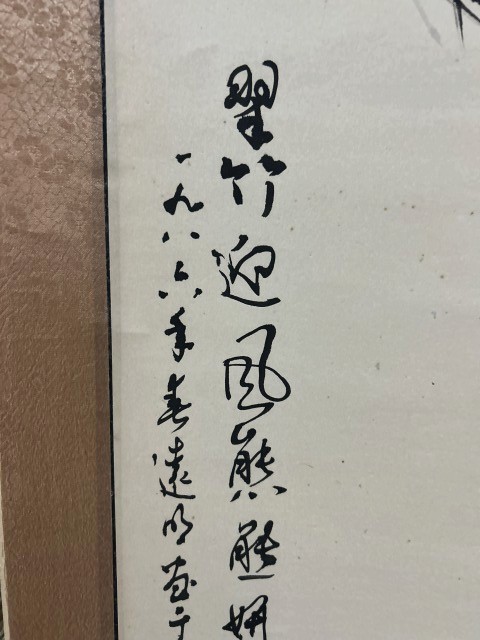 凛とし迷いのない力強い筆致で描かれた、水墨竹図の掛軸でございます。