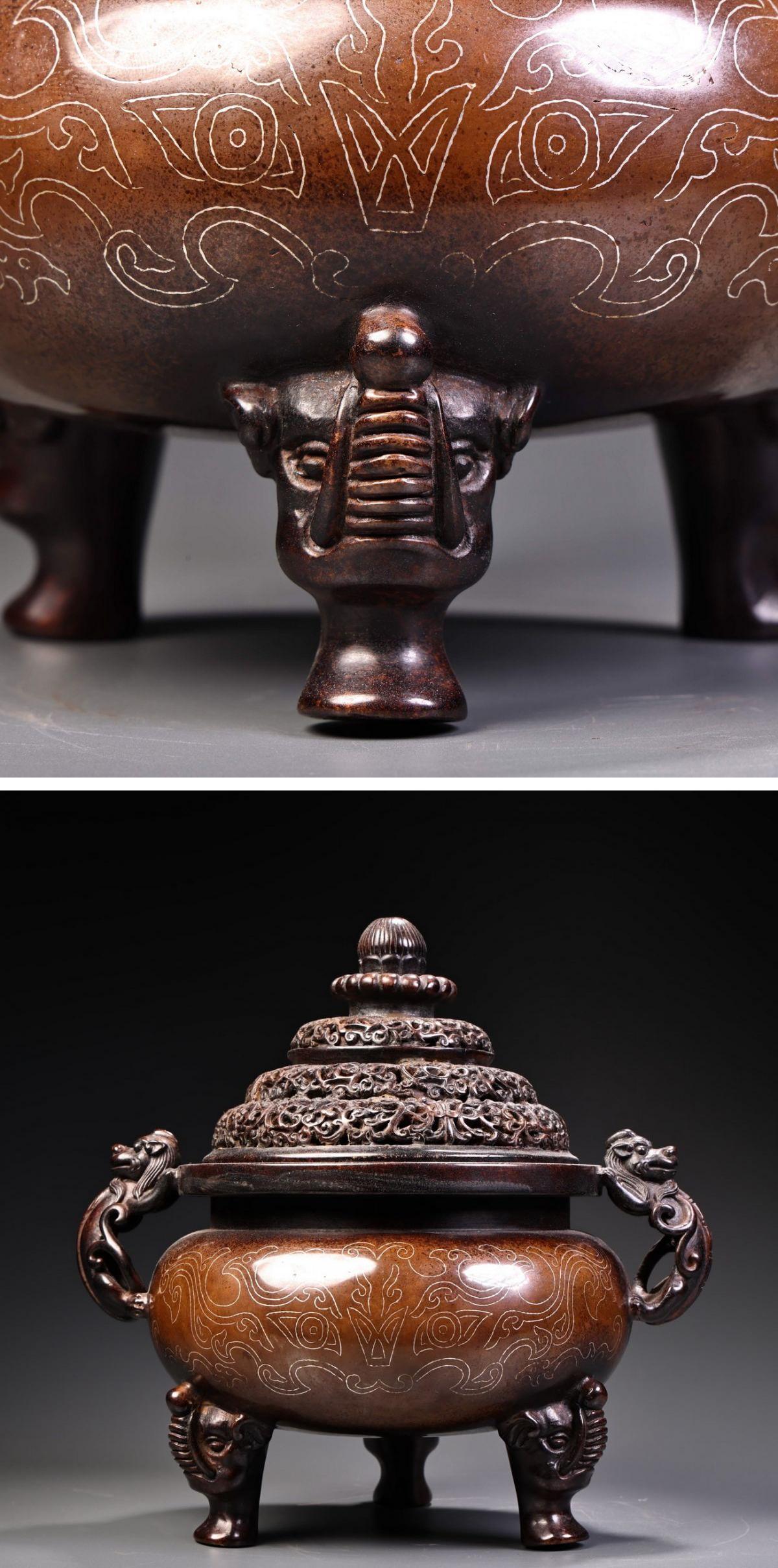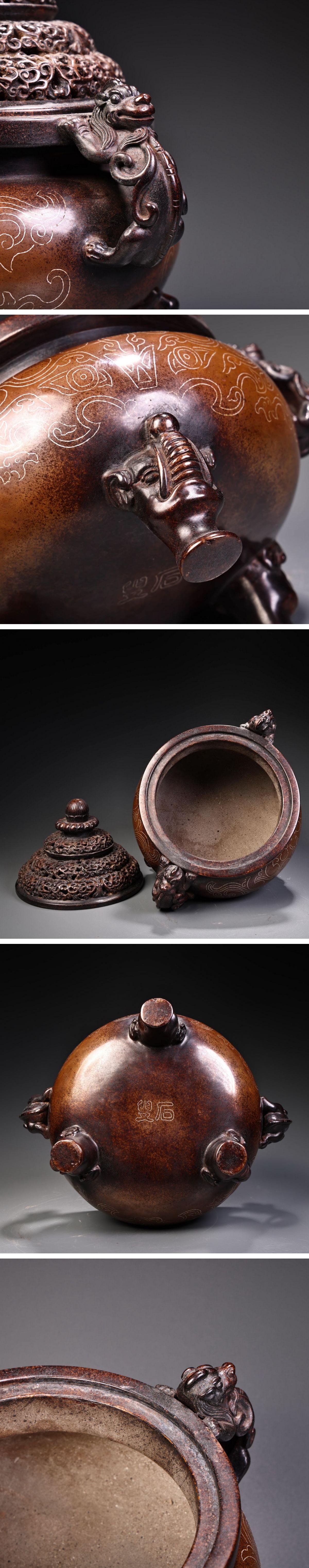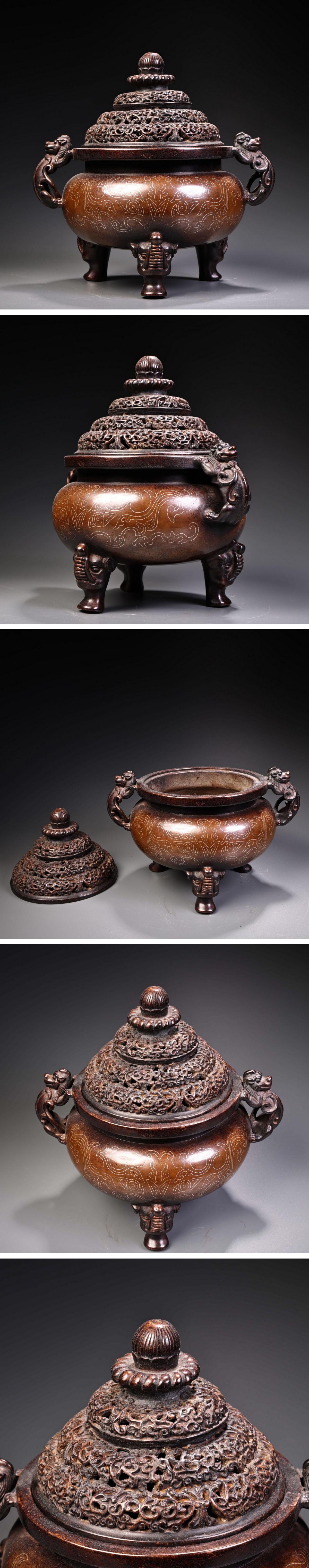 【清】関西某オークション購入 中国・清時代 石叟在銘 象嵌銀糸香爐 極細工 古置物 古擺件 中国古美術7L12-RQ4