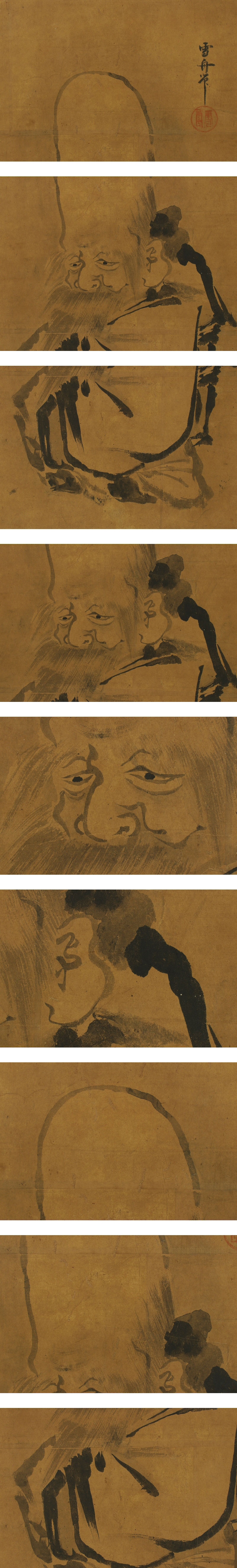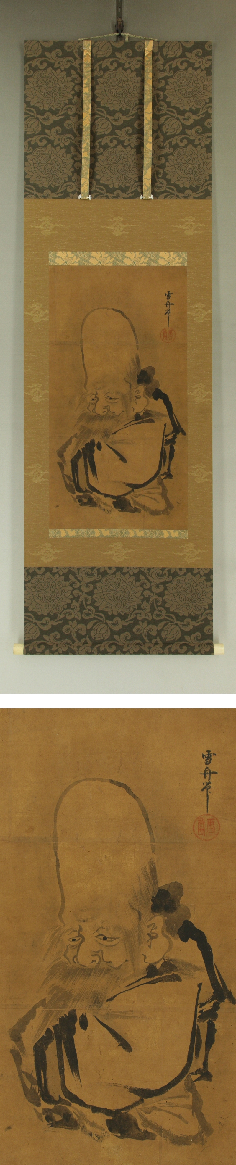 雪舟 せっしゅう(1420-1506) 室町後期の画僧。備中の人。諱は等楊。 京都の相国寺に入り、画技を周文に学んだ。山口に画房、雲谷庵を開設。 渡明を挟んで宋元画を広く学び、のち大分に天開図画楼を開設。 自然に対する深い観照のもとに個性豊かな水墨山水画様式を完成し、後世に多大な影響を与えた。 本紙は、染み痕、虫食い痕、ヤケ痕があります。 表装は、良好です。軸先にヒビがあります。 【サイズ】 作品 横約36cm×縦約69cm 表装 横約48.5cm×縦約160cm |