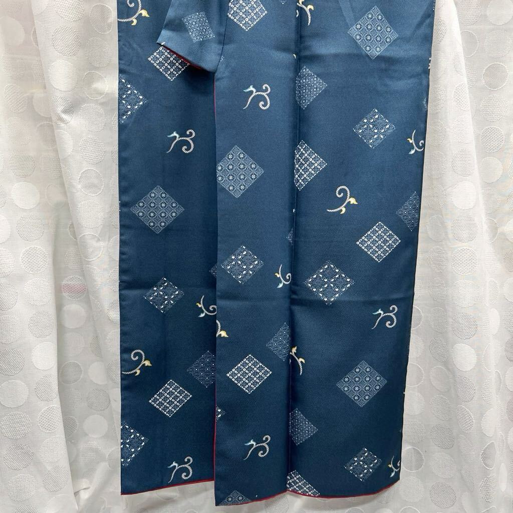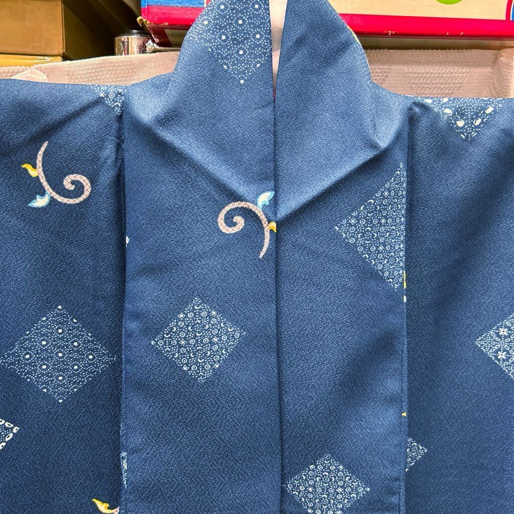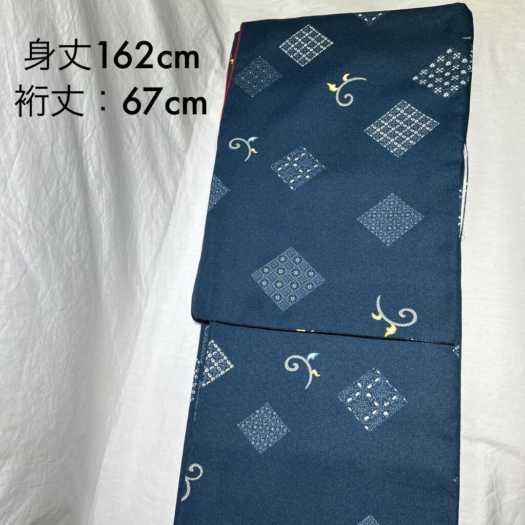 ★美品★洗える着物 ポリエステル 袷 青系 小紋 Lサイズ 身丈162cm 裄丈67cm 洗濯OK 広衿 菱文 きもの レディース 女性 初心者(09036②並