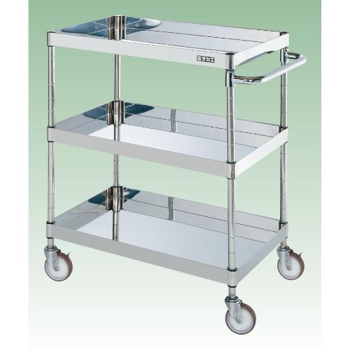 ボルトレスで組立簡単。棚板を逆さにするだけで、皿型・フラット型と組み替えることができます。油に強く床面に跡がつきにくいナイロンウレタン車を採用。