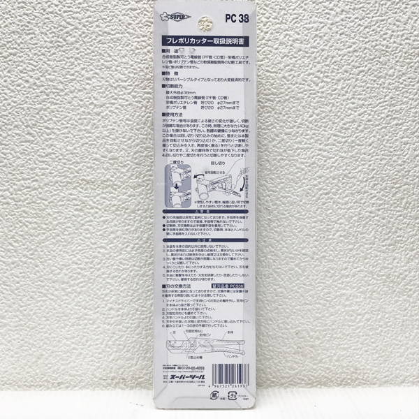 | 規格・仕様 | 樹脂フレキ管・サヤ管・ポリブデン管等、軟質樹脂管をスカッと切断します。刃を逆に取付けることにより、2度使用可能で大変経済的です。※塩ビ管は切断できません。 材質:アルミ合金 仕上げ:シャンパンゴールド焼付塗装 切断能力:外径38mm以下 適用替刃:PCS38 |