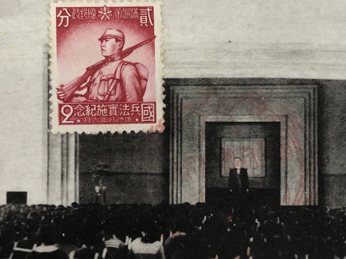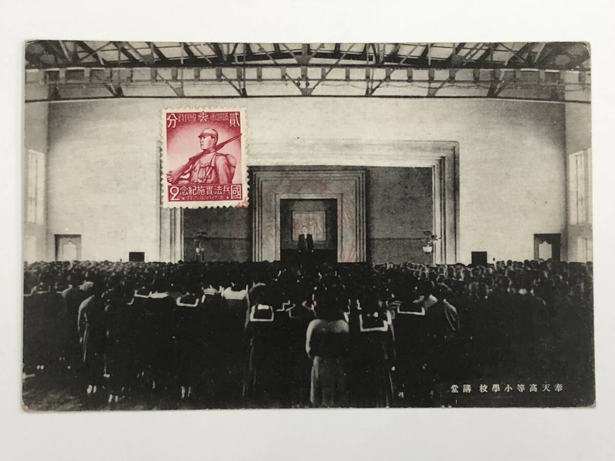 | 古絵葉書『奉天高等小学校講堂』満洲帝国・国兵法実施紀念2分切手貼付/スタンプ押印/満洲/レトロ | ||