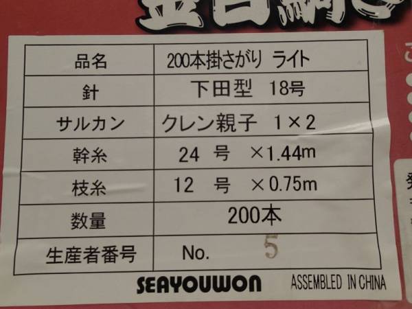 | 新品 下田漁具 金目鯛(キンメ)さがり 200本掛(200本連結) ライト【キンメ仕掛け】 です。 スペック 針:ムツ18号 幹糸:24号 1,44m ハリス:12号 0,75m 200本連結 お好みの本数でカットしてご使用下さい。 発送は未開墾の物を送ります。 ノークレーム、ノーリターンでお願いいたします。 写真の物がすべてです。 神経質な方のご入札はご遠慮下さい。 |