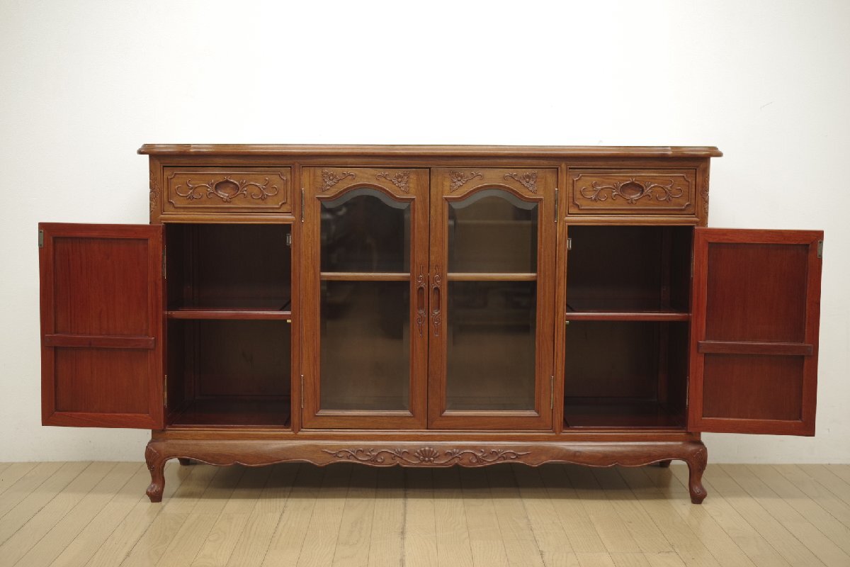 【商品紹介】 花梨材を使用した重厚感のあるサイドボードです。 高級木材である唐木の中でも代表的な花梨材。 美しい杢目、独特の光沢が特徴です。体積あたりの密度が高いため非常に硬く、頑丈な点も魅力です。 狂いが少なく割れにくい材質で、末永く利用可能な高級家具に使用されます。 収納力もありますので、便利にご活用できそうです。 和室にはもちろん、洋の空間に置いても落ち着いた大人の空間を演出してくれるのではないでしょうか。 【コンディション】 中古・使用品です。 ・引き出し内に擦れ傷がございます。 ・引き出しのレールに落としきれない汚れがございます。 ・開き戸収納内、背面に微細な打痕や擦れ傷がございます。 全体的に目立つ大きなダメージもなく、まだまだご愛用頂ける状態です。 ※清掃、撮影時に目立つ箇所を抜粋して写真掲載しておりますが、同等の傷などがあるものとご了承ください。尚、商品ページの追加写真にて状態をご確認の上、ご検討いただけますよう、お願いいたします。 この他にも商品を多数出品しておりますので、こちらから御覧下さい。 | ||