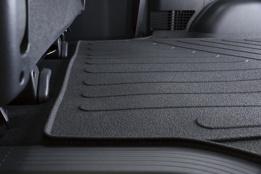 | ■商品説明 | 1ピース構造で、かなりの厚みと重量のあるラバー製荷室マット。耐久性に非常に優れています。(標準ボディ用:約18kg、ワイドボディ用:22kg)両サイドは縁が立ち上がっているので、水分やゴミの広がりを防止できます。 また、表面は特殊処理を施しているので、移動中でも荷物がズレにくくなっています。 ※スライドフロア、3Dラバーカーゴマットとの同時装着は不可。 |