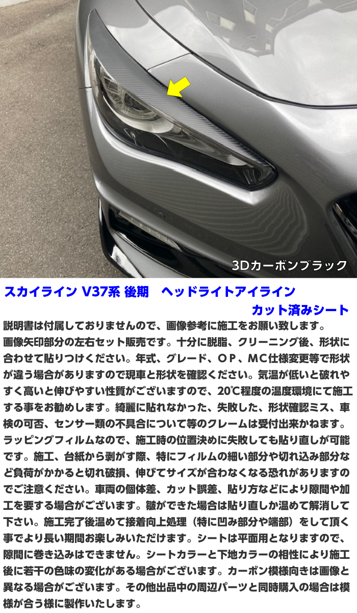 スカイラインV37系後期ヘッドライトアイラインカット済みシート(左右セット) 後期で開発しているため前期への流用は分かりかねます。 MC仕様変更やOP、グレード等で形状が異なる場合がありますので現車をご確認ください。 ★材質:PVC ★厚さ 約0.12mm~0.18mm(シート種類による) ★耐熱90度 ★屋外約2-3年(メーカー値、使用環境、シートの種類による)