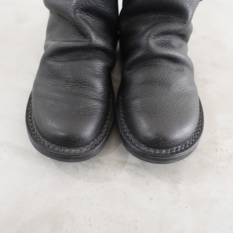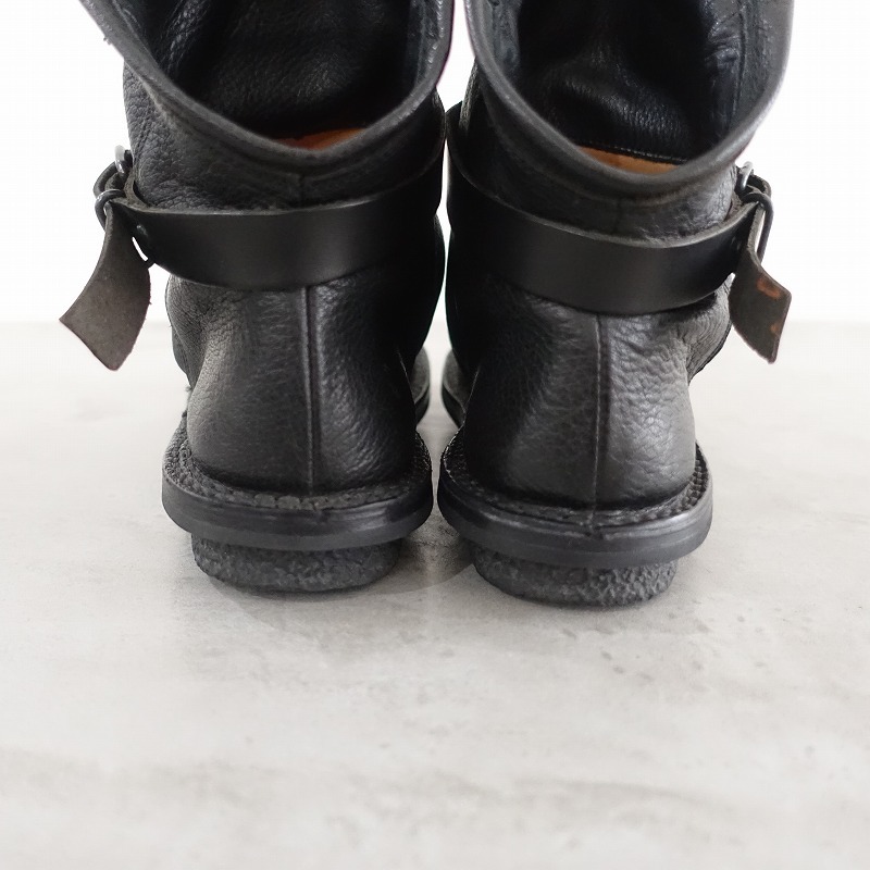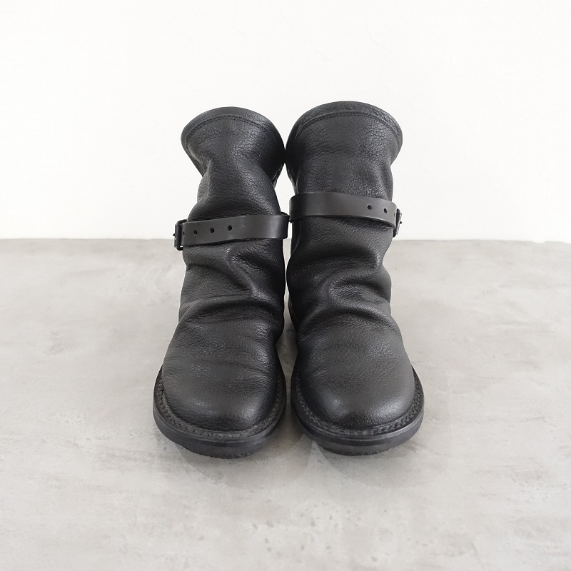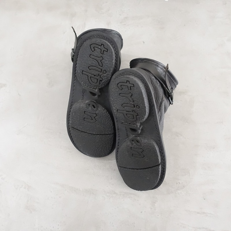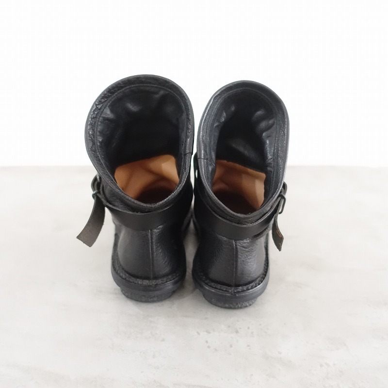 | trippenのレザーショートブーツ BOMBです。カラーはブラックで、レザー素材です。履き口が斜めにカットされたデザインで、折り曲げてアレンジして着用もできます。履き口にパイピングが施されており、履き口まわりにはベルトがあしらわれております。ベルトは7段階に調節が可能です。定価(メーカー希望小売価格)44,000円の商品です。 |