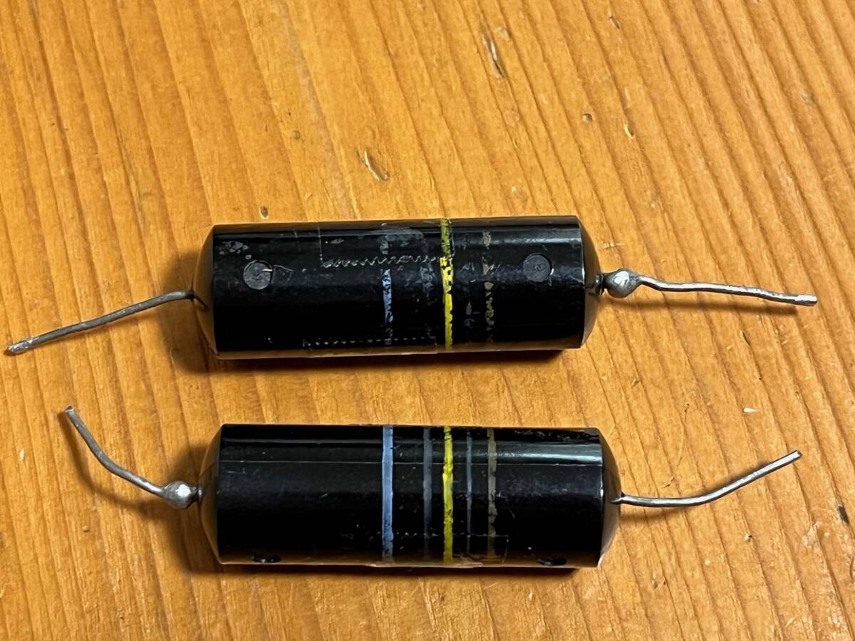 かなり前に製造された、スプラグ社の中古品です。規格は0.1μF 400V。 実測値は0.106と0.091μFでした。横河電機の絶縁抵抗計で測定しその抵抗値をシール上に表示しています。少し耐圧より高い500Vを掛けた時の抵抗値になります。リード線は短かったり、継ぎ足してあります。実機でのテストはしていませんので、まるっきりリークがない、などの保証はできません。低圧回路での使用をお勧めします。ギター内のハイパス用にもってこいかもしれません。ジャンクとして出品しますので、ノークレームでお願いします。