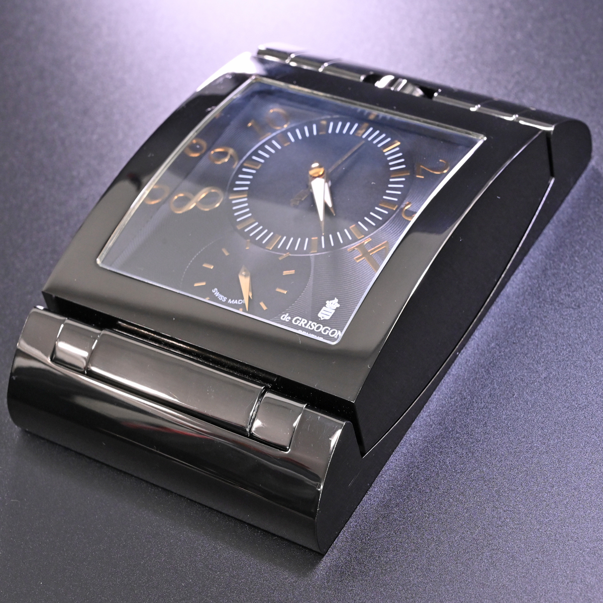 ドゥ グリソゴノのブラックPVD デュアルタイムゾーン デスククロックです。 創始者でもあるファワズ・グルオジは、かつてブルガリやハリー・ウィンストンに在籍。 世界に先駆けてブラックダイヤモンドをセットしたジュエリーを手がけるなど、オリジナリティーに溢れた『ドゥ グリソゴノ』ならではの雰囲気を存分に感じる事の出来るこちらのモデル。 二か国の時刻を表示できるデュアルタイムゾーンにアラーム機能も搭載。 市場にも全く出てこないメゾンのお品なのでお探しの方も非常に多いかと思います。 ※基本動作確認済。 |