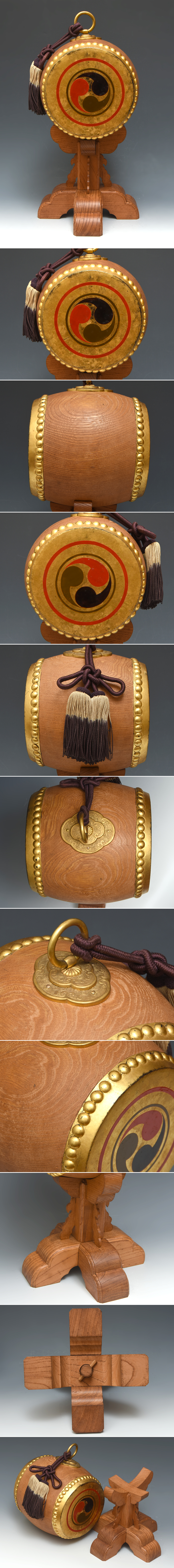 平安 まるや平蔵 丸平 丸屋 / 大木平蔵(製)陣太鼓です。 陣太鼓は本来は軍陣で、軍勢の進退を指示し、士気を鼓舞するために打った太鼓です。 撥などは付属しておりません。 多少の経年変化は見られますが、目立つ汚損破損はなく状態は良好です。 ※予めご了承の上ご入札お待ちしております。 ※撮影の際に生じた写り込みなどがございます。 ご理解の程よろしくお願い致します。 |