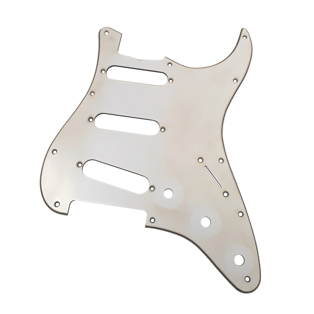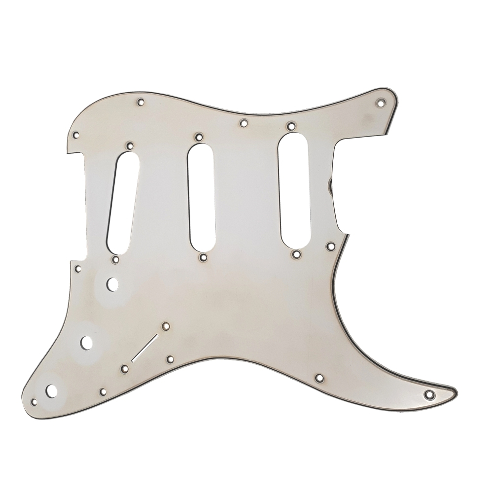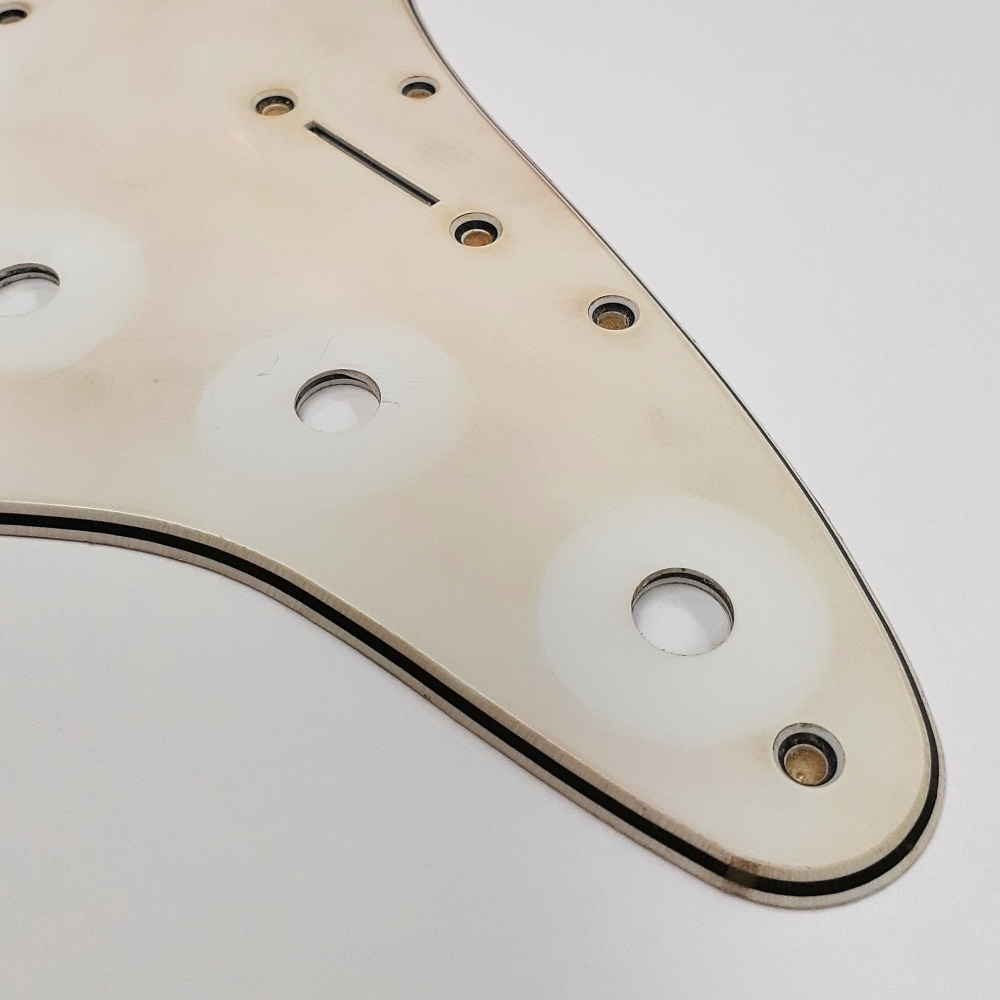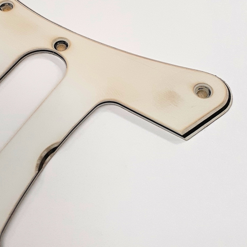 ホワイトのピックガードに特殊加工を施したレリックパーツ。